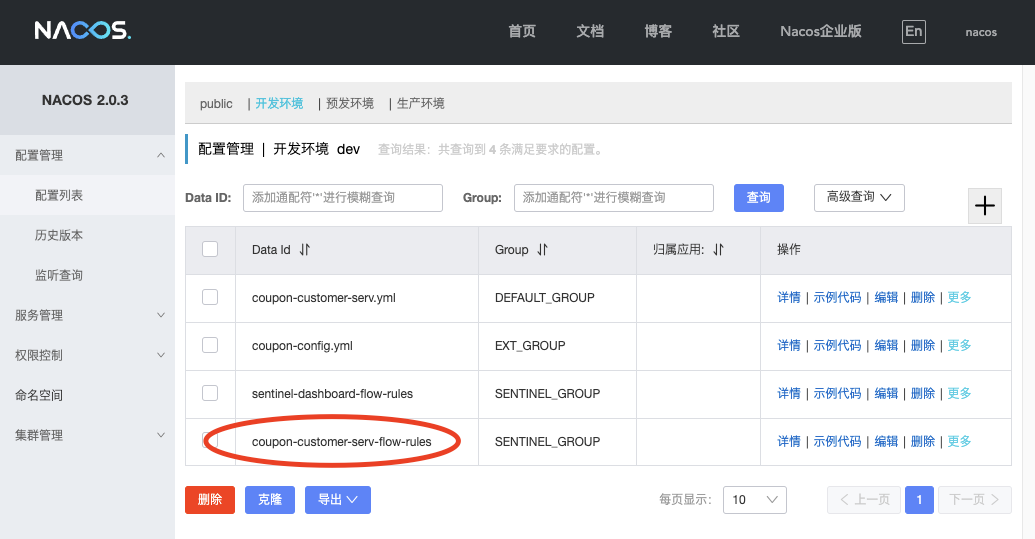 最后,打开Nacos Config的配置列表页,你就可以看到一个coupon-customer-serv-flow-rules的配置文件被创建了出来,它的Group是“SENTINEL_GROUP”。