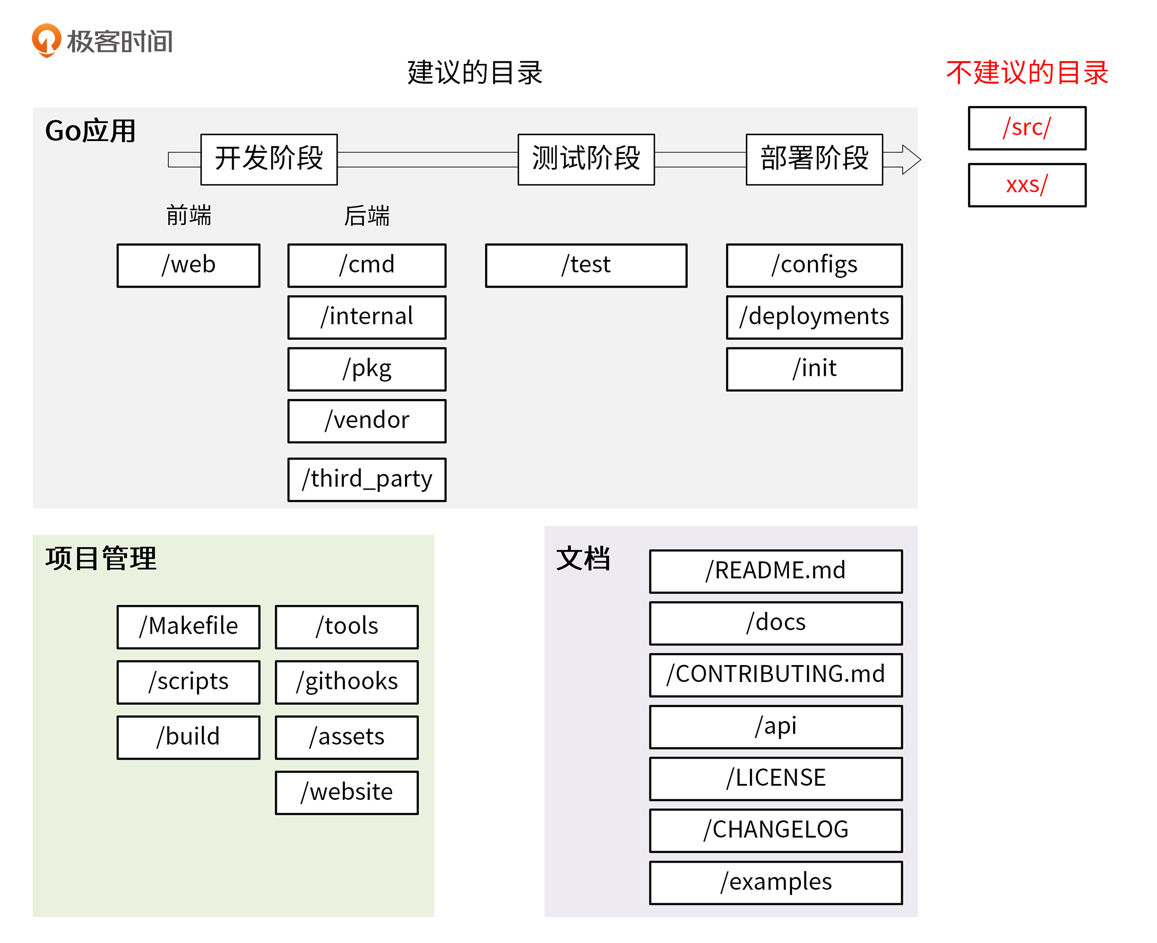 在我看来,一个 Go 项目包含 3 大部分:Go 应用 、项目管理和文档。所以,我们的项目目录也可以分为这 3 大类。同时,Go 应用又贯穿开发阶段、测试阶段和部署阶段,相应的应用类的目录,又可以按开发流程分为更小的子类。当然了,这些是我建议的目录,Go 项目目录中还有一些不建议的目录。所以整体来看,我们的目录结构可以按下图所示的方式来分类: