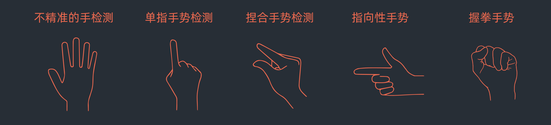 - 骨骼绑定是非常好的一种手势识别技术,需要设计师去根据关键关节点去设计合适的动作。