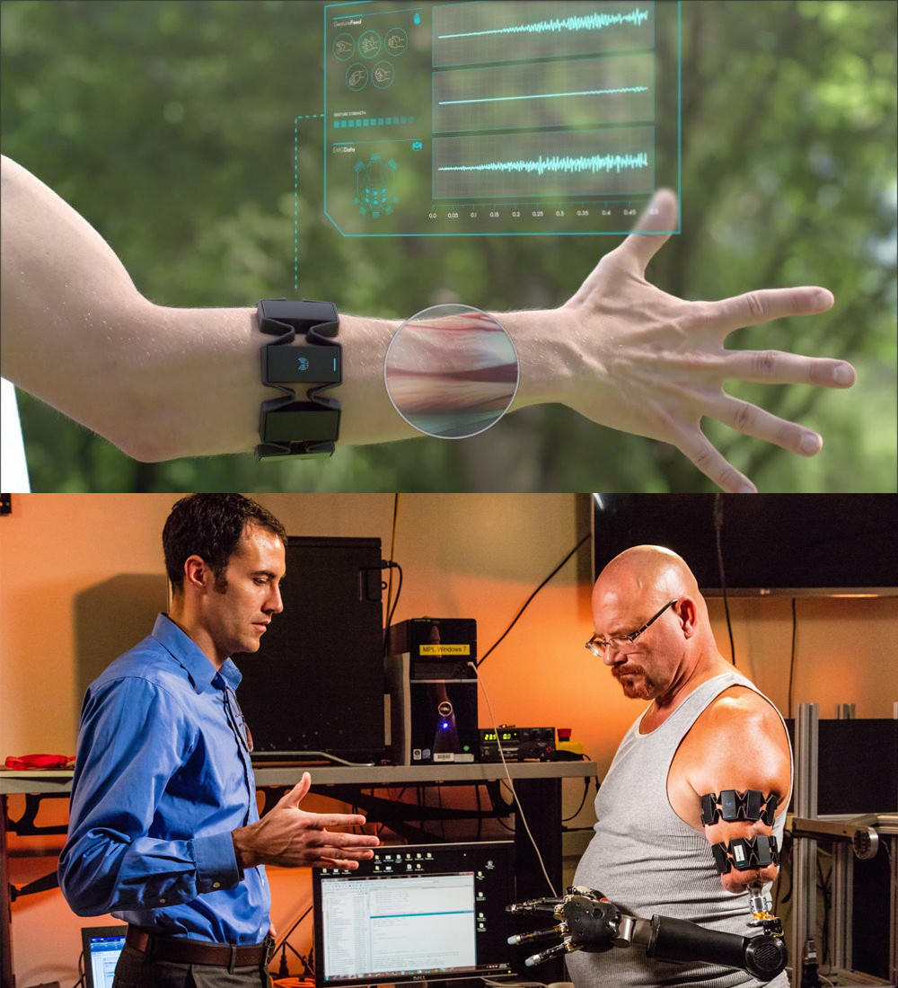 Myo臂环就是一款典型的穿戴在手臂上的手势识别设备。这种设备有一种特别的好处就是可以帮助失去前臂和手的残障人士。因为人即便失去了前臂,人脑还是会尝试控制胳膊的肌肉。把这种设备穿戴在胳膊上,即使是残障人士也是可以控制假肢实现张开手、握手、握拳、拾起物体、旋转手臂等复杂动作。