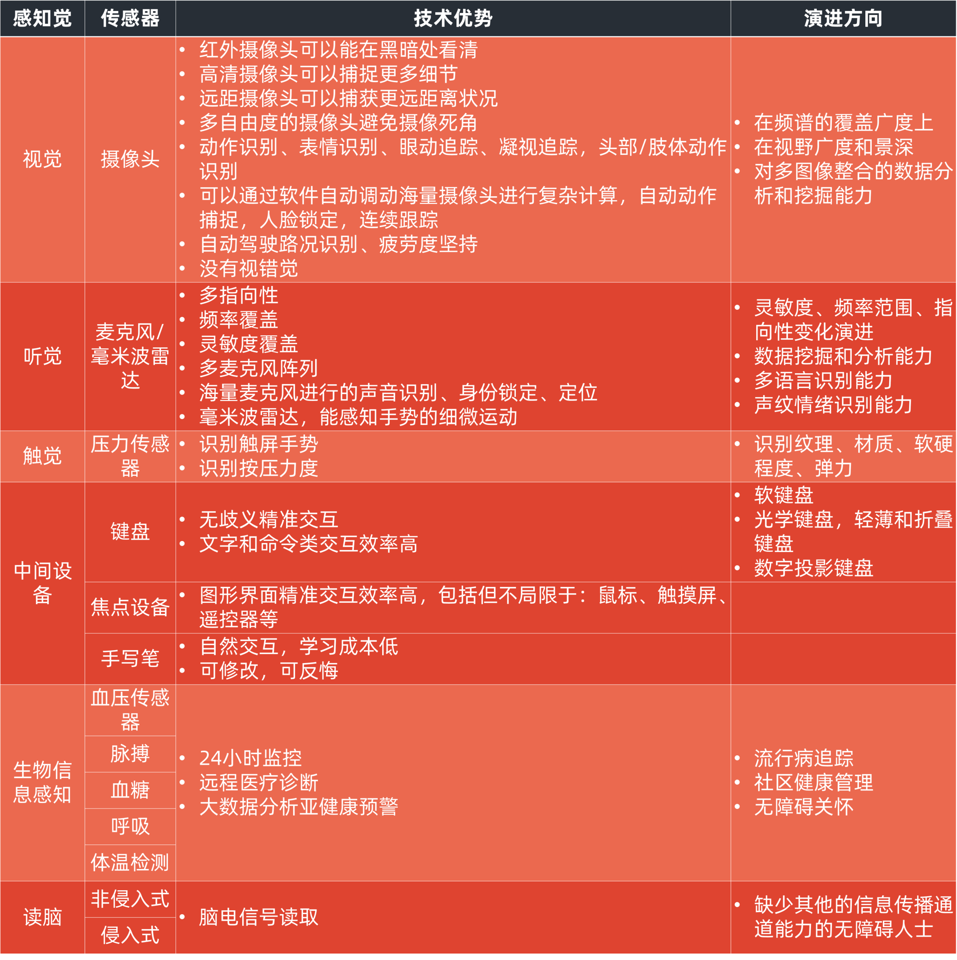 我下面列出了几种类似的感知觉技术优势和演进方向的表格,你可以对照着感受一下。