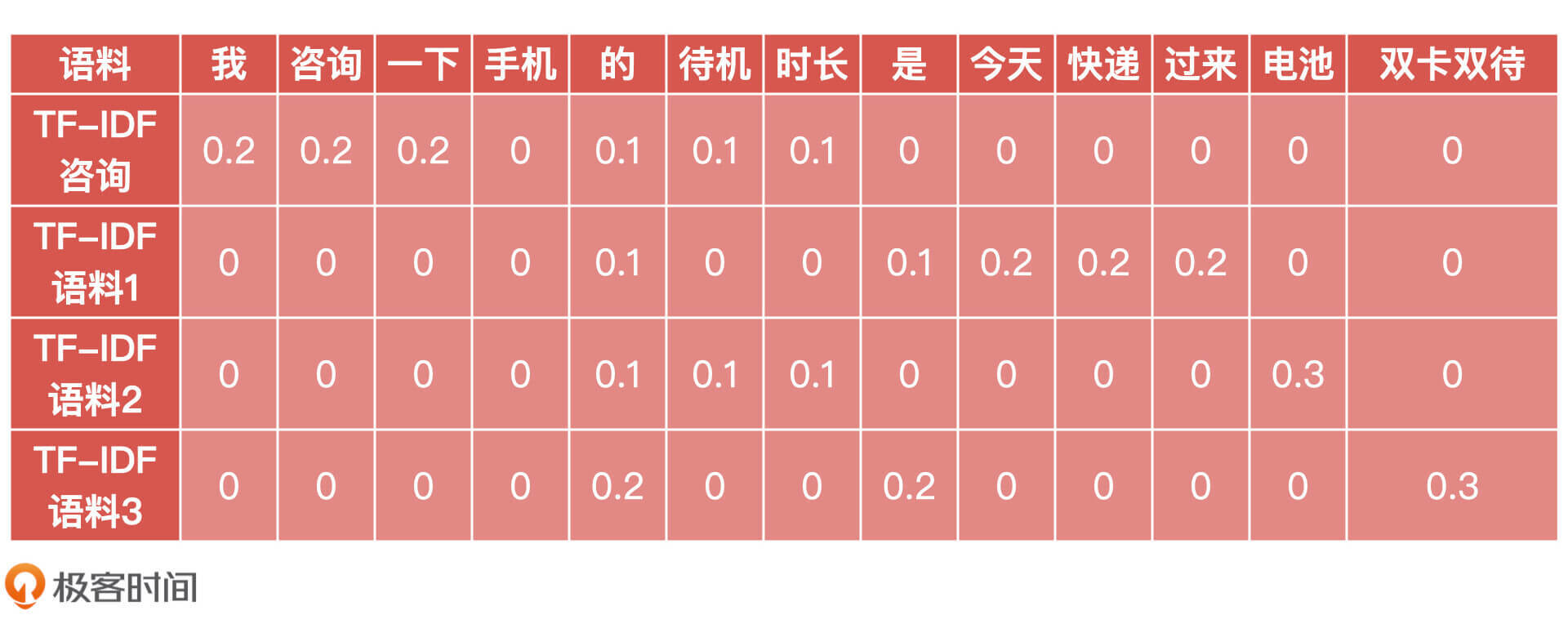 从表中我们可以看出,每个词在每段语料中的权重,于是我们得到了每段语料经过 TF-IDF 计算后的新向量形式: