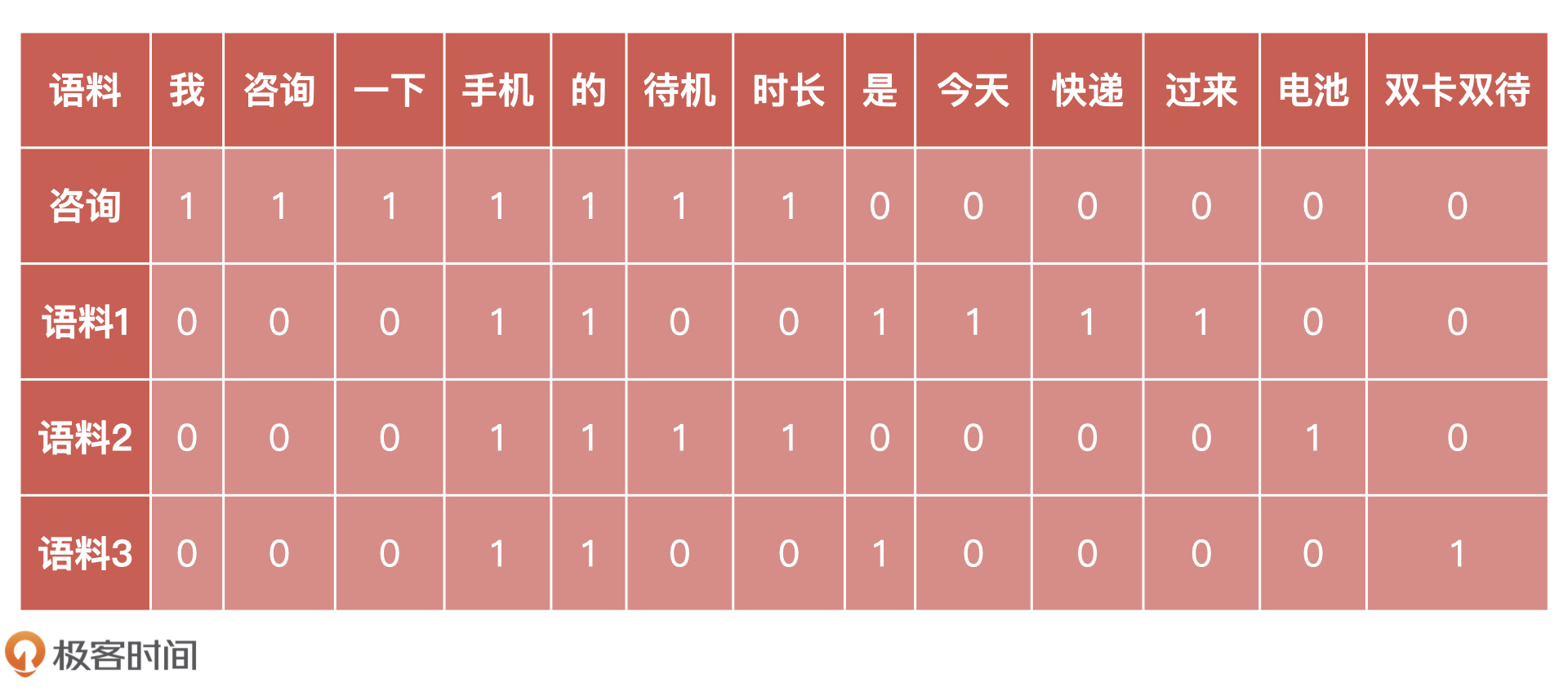 然后,为了计算相似度,我们需要将每一个已分词的语料,通过词频表示为一个个的向量,如下所示。例如“电池”这个词,只在“语料 2”中出现 1 次,我们就标注为“1”,在其他语料中没有出现,则标注为“0”。
