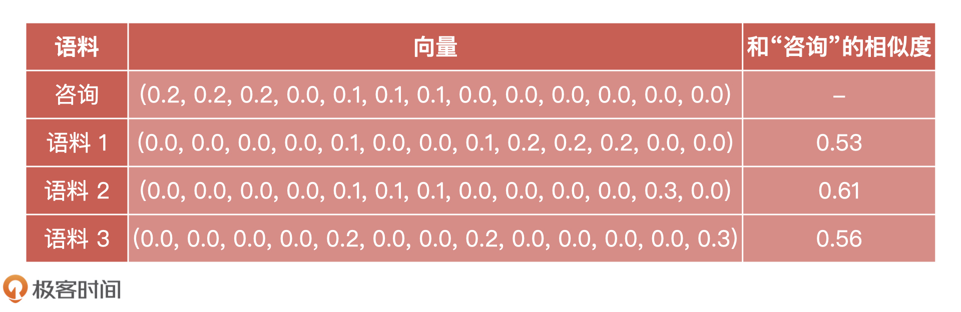 - 语料 2:(0.0, 0.0, 0.0, 0.0, 0.1, 0.1, 0.1, 0.0, 0.0, 0.0, 0.0, 0.3, 0.0)