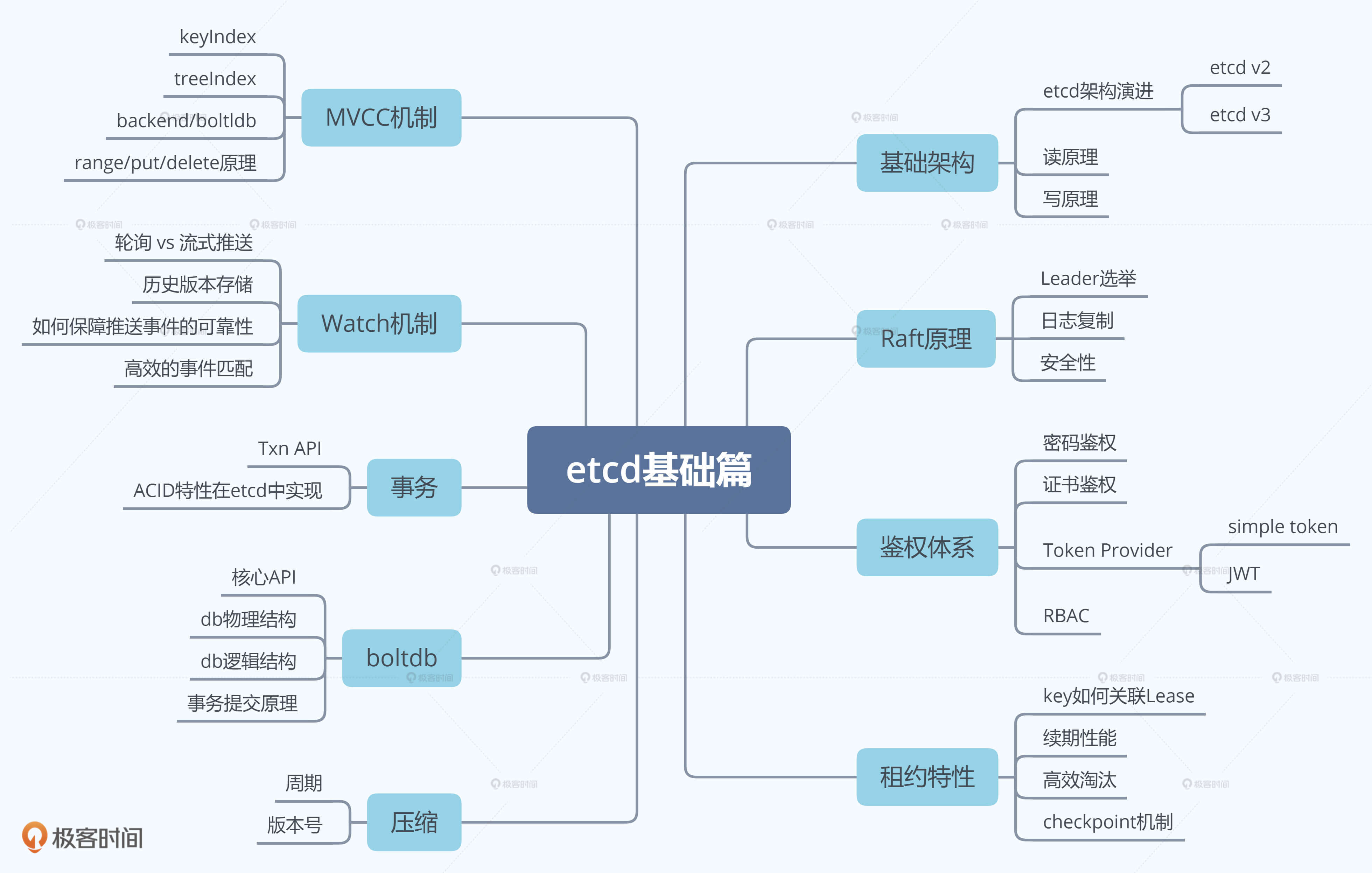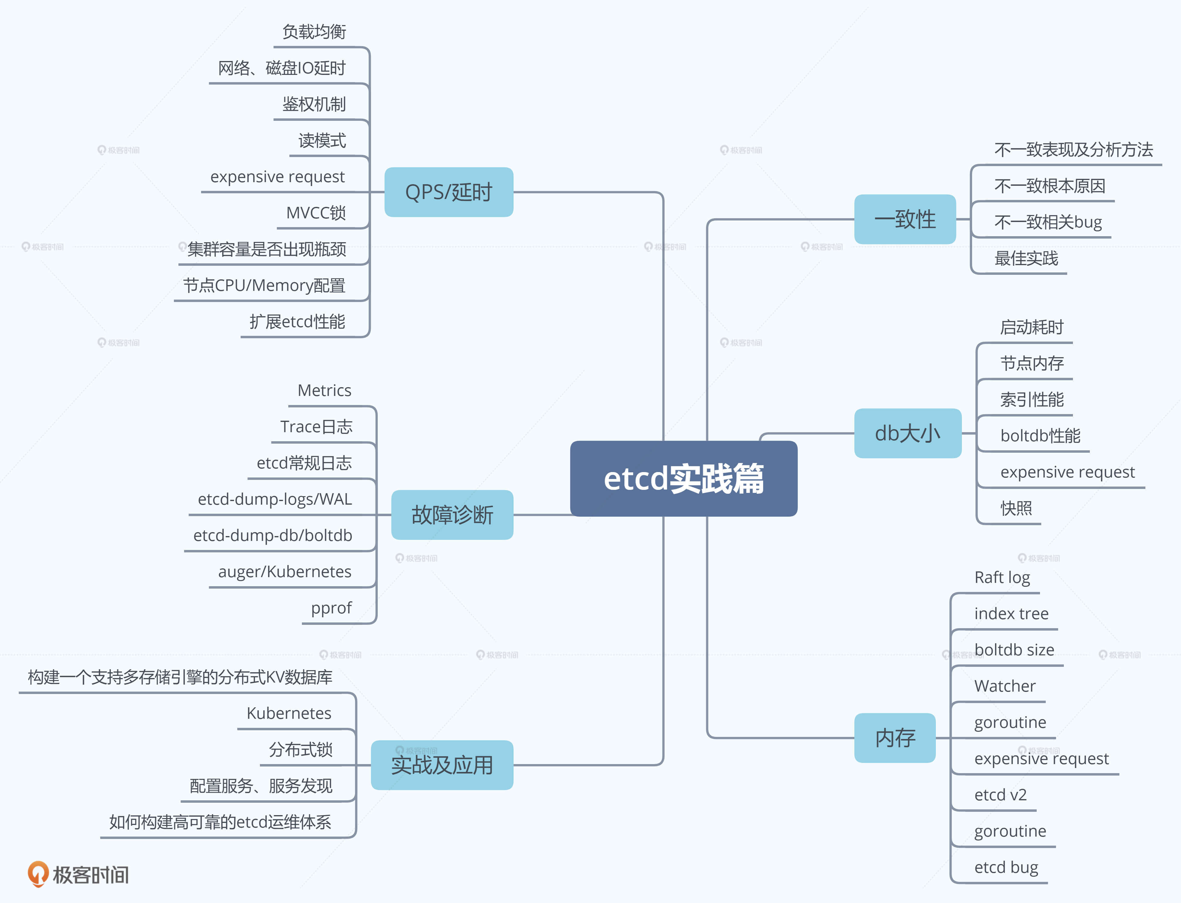 - etcd基础架构。通过为你梳理etcd前世今生、分析etcd读写流程,帮助你建立起对etcd的整体认知,了解一个分布式存储系统的基本模型、设计思想。