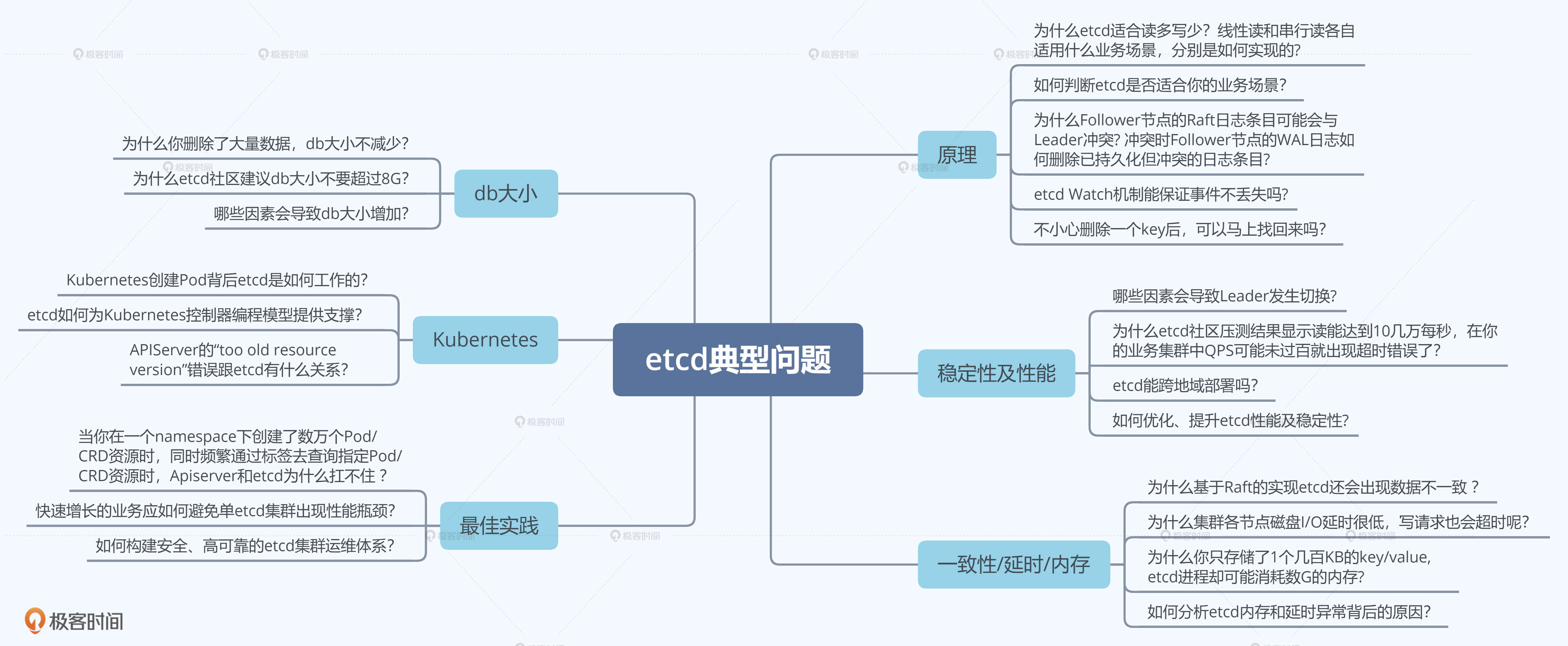 当然,你在学习和使用etcd、Kubernetes过程中遇到的问题肯定远远不止这些,下面我用思维导图给你总结了更多类似问题,你可以对照自身的经历去看一下。
