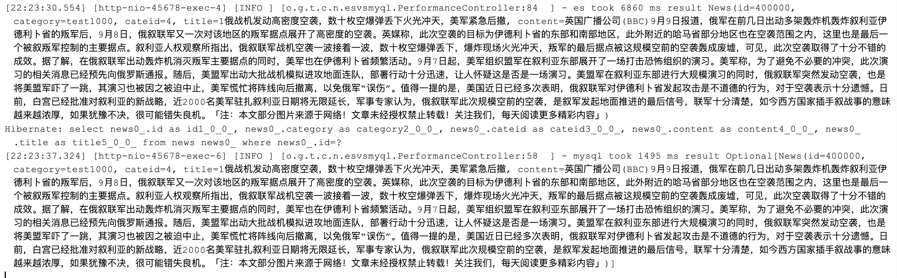 [22:04:00.951] [http-nio-45678-exec-6] [INFO ] [o.g.t.c.n.esvsmyql.PerformanceController:48 ] - took 48 ms result 2100 Hibernate: select count(news0_.id) as col_0_0_ from news news0_ where news0_.cateid=? and (news0_.content like ? escape ?) and (news0_.content like ? escape ?) [22:04:11.946] [http-nio-45678-exec-7] [INFO ] [o.g.t.c.n.esvsmyql.PerformanceController:39 ] - took 6637 ms result 2100