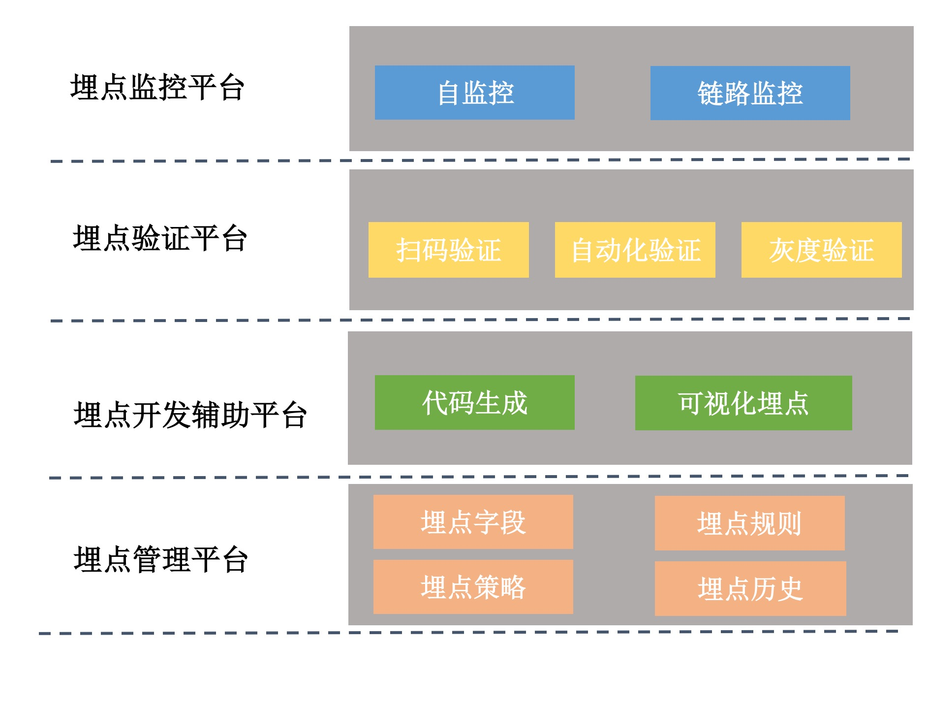 - 埋点监控平台。监控的目标是保证整个数据链路的健壮性,这里包括对客户端“高可用上报组件”的监控,例如上一期讲到的质量监控和容灾监控。还有对后端数据解析、存储、分析的监控,例如总日志量、日志异常量、日志的丢失量等。