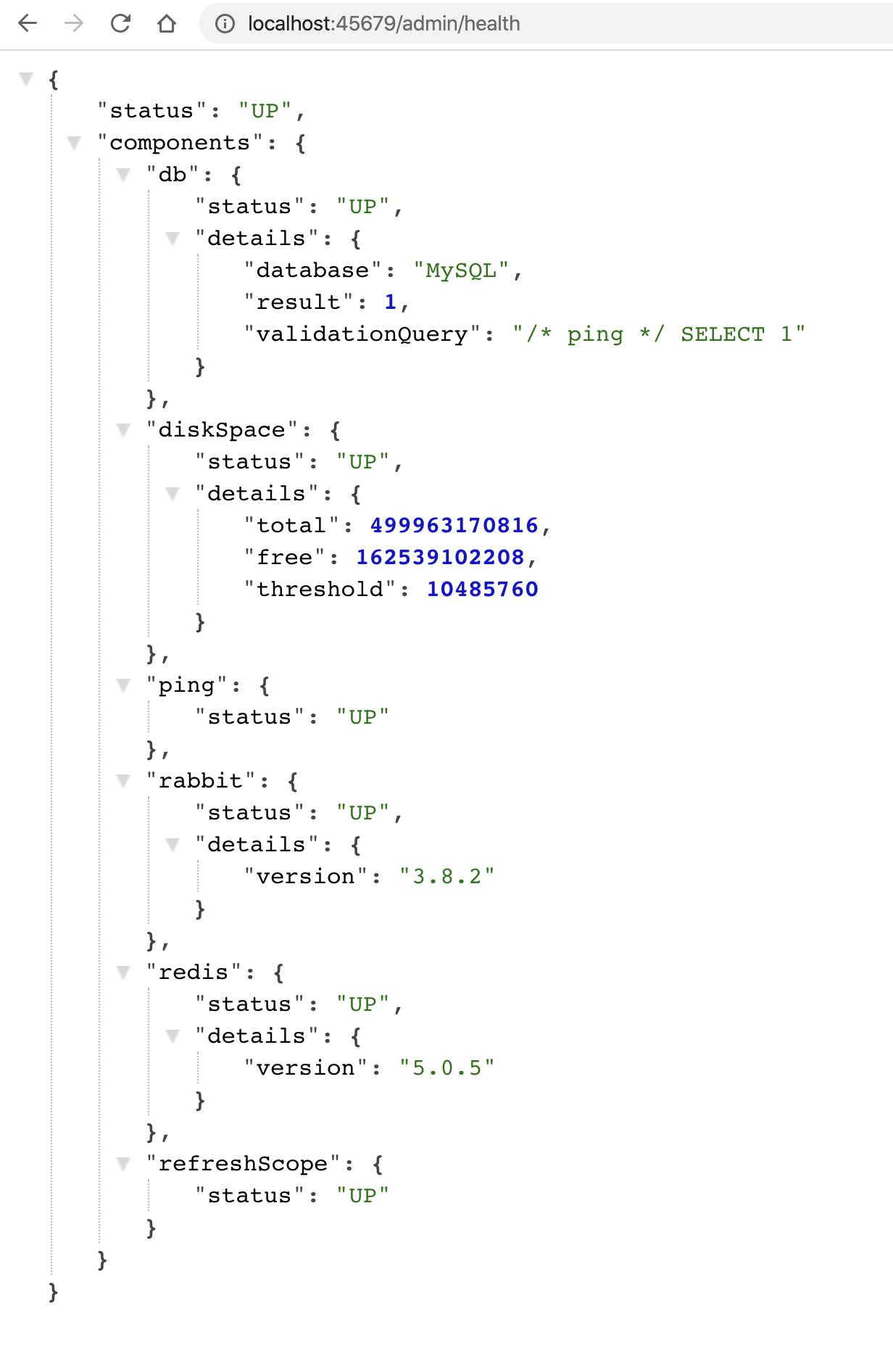 访问health端点可以看到,数据库、磁盘、RabbitMQ、Redis等组件健康状态是UP,整个应用的状态也是UP: