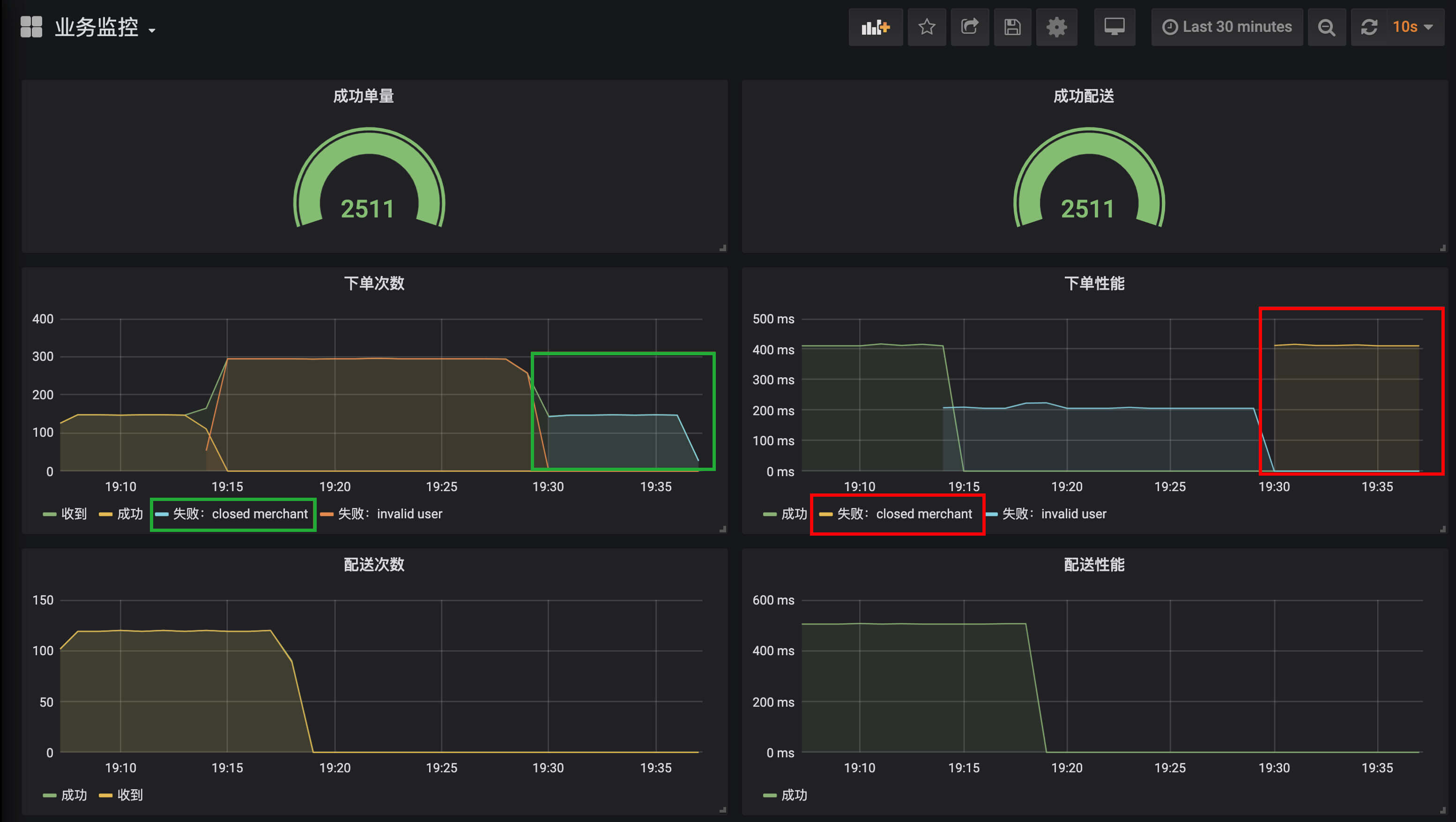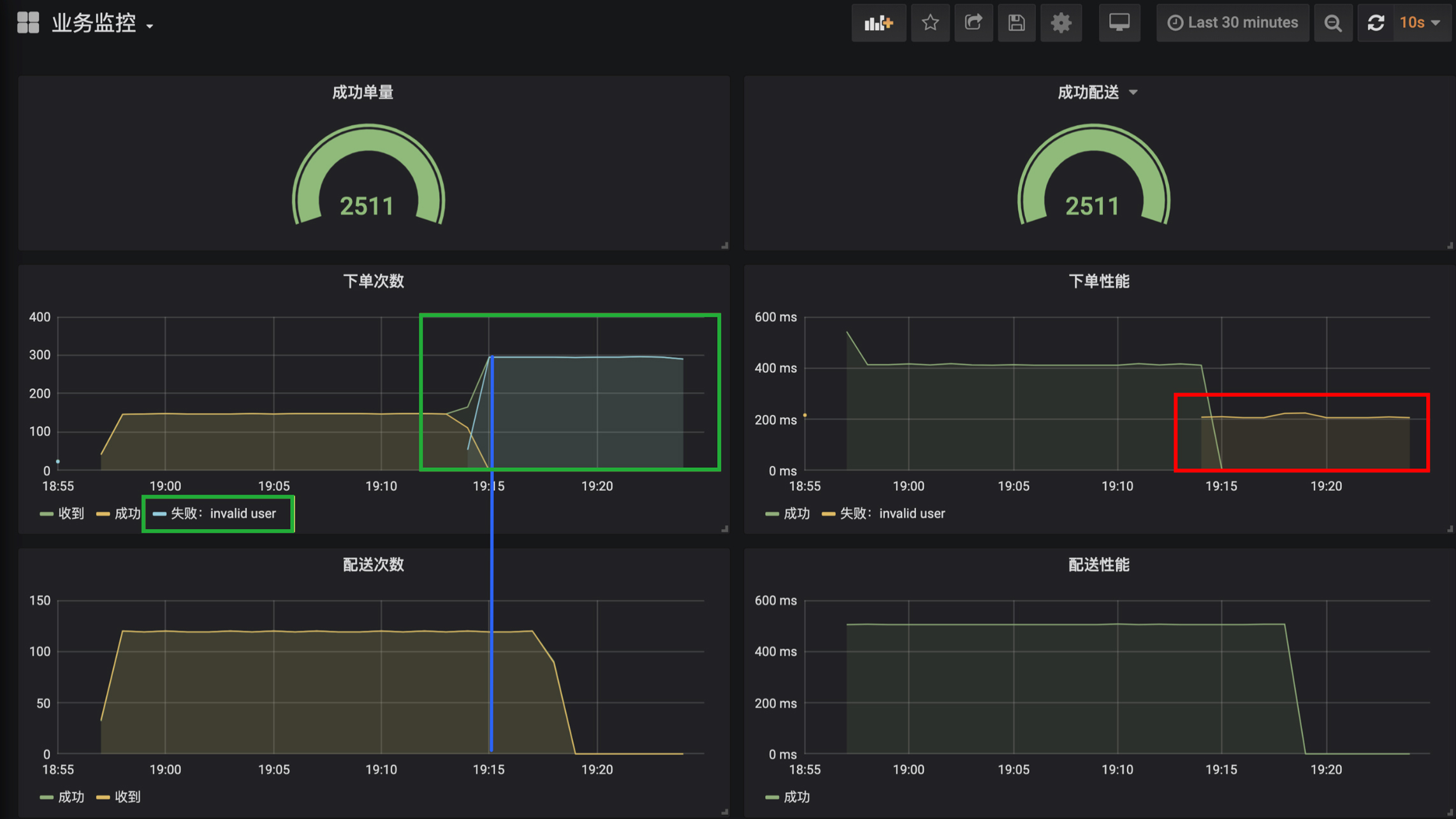 绿色框可以看到,下单现在出现了invalid user这条蓝色的曲线,并和绿色收到下单请求的曲线是吻合的,表示所有下单都失败了,原因是无效用户错误,说明源头并没有问题。 红色框可以看到,虽然下单都是失败的,但是下单操作时间从400ms减少为200ms了,说明下单失败之前也消耗了200ms(和代码符合)。而因为下单失败操作的响应时间减半了,反而导致吞吐翻倍了。 观察两个配送监控可以发现,配送曲线出现掉0现象,是因为下单失败导致的,下单失败MQ消息压根就不会发出。再注意下蓝色那条线,可以看到配送曲线掉0延后于下单成功曲线的掉0,原因是配送走的是异步流程,虽然从某个时刻开始下单全部失败了,但是MQ队列中还有一些之前未处理的消息。