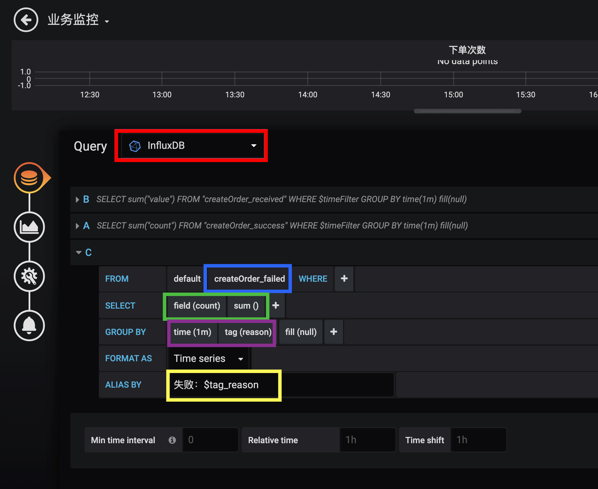 红色框数据源配置,选择刚才配置的数据源。 蓝色框FROM配置,选择我们的指标名。 绿色框SELECT配置,选择我们要查询的指标字段,也可以应用一些聚合函数。在这里,我们取count字段的值,然后使用sum函数进行求和。 紫色框GROUP BY配置,我们配置了按1分钟时间粒度和reason字段进行分组,这样指标的Y轴代表QPM(每分钟请求数),且每种失败的情况都会绘制单独的曲线。 黄色框ALIAS BY配置中设置了每一个指标的别名,在别名中引用了reason这个tag。 使用Grafana配置InfluxDB指标的详细方式,你可以参考这里 。其中的FROM、SELECT、GROUP BY的含义和SQL类似,理解起来应该不困难。
