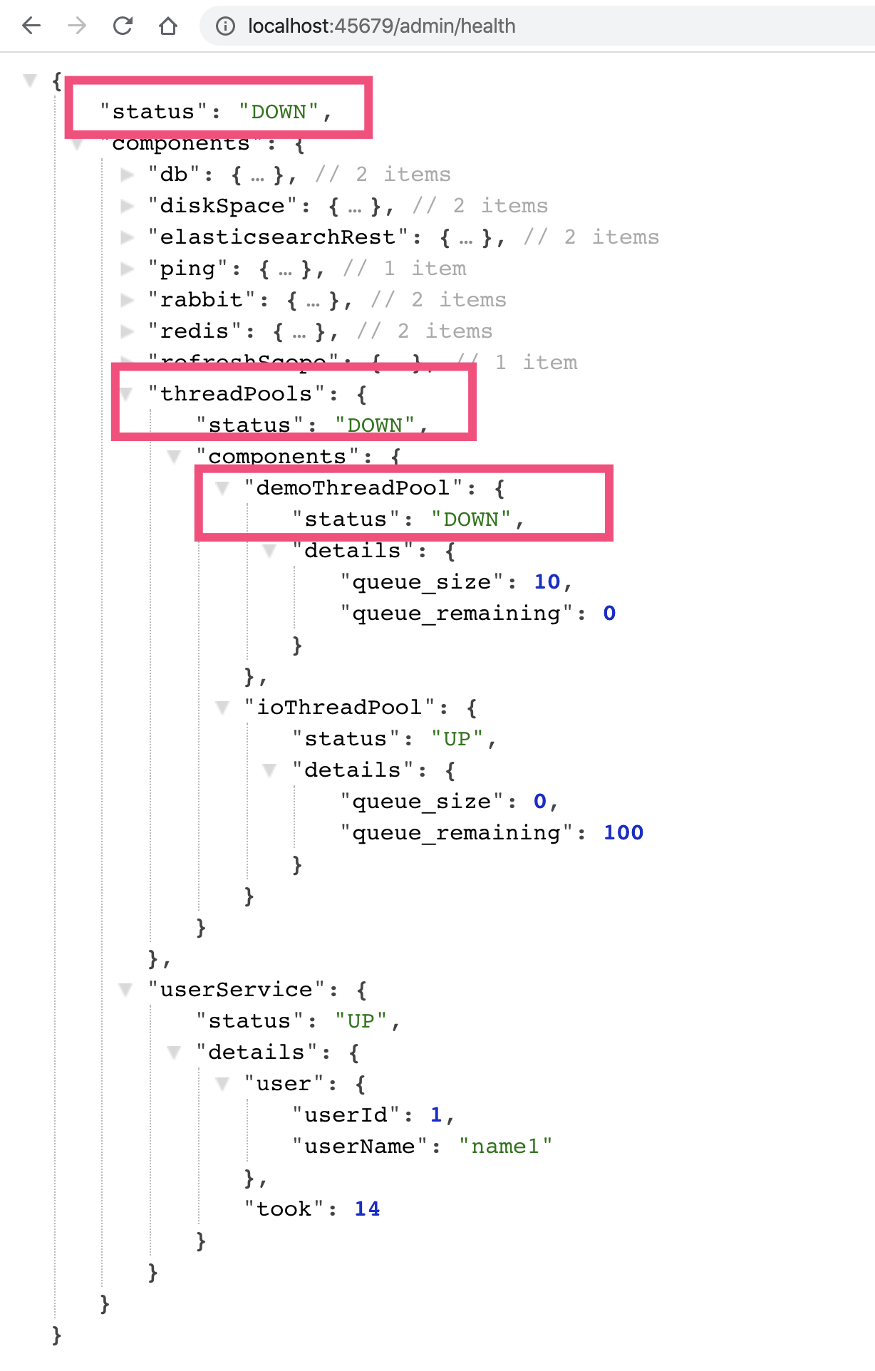 程序启动后可以看到,health接口展现了线程池和外部服务userService的健康状态,以及一些具体信息: