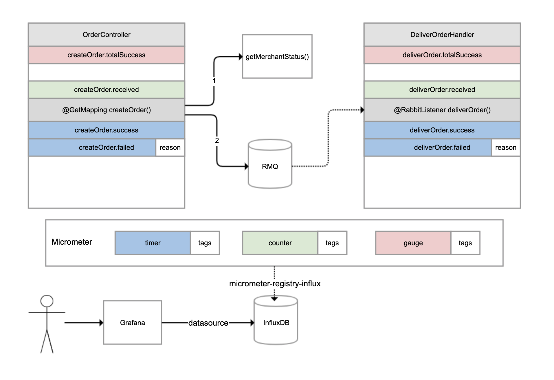 下单总数量指标,监控整个系统当前累计的下单量; 下单请求指标,对于每次收到下单请求,在处理之前+1; 下单成功指标,每次下单成功完成+1; 下单失败指标,下单操作处理出现异常+1,并且把异常原因附加到指标上。 对于配送操作,也是建立类似的4个指标。我们可以使用Micrometer框架实现指标的收集,它也是Spring Boot Actuator选用的指标框架。它实现了各种指标的抽象,常用的有三种: