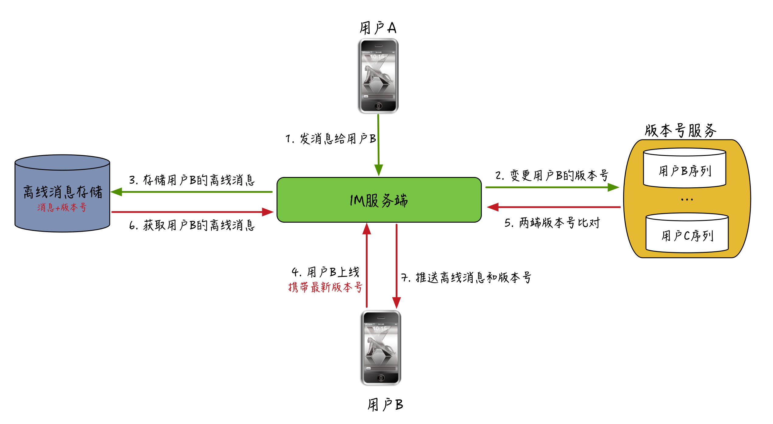 - 当有消息或者信令需要推送给该用户时,会为每条消息或者信令生成一个版本号,并连同消息或者信令存入离线存储中,同时更新服务端维护的该用户的最新版本号。