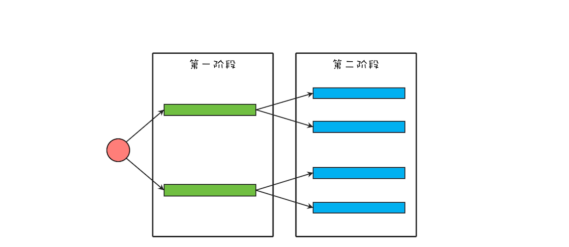 这个出问题的应用,相关的逻辑精简之后,如下图所示,该应用将一个大型的计算任务分成两个阶段,第一个阶段的任务会等待第二阶段的子任务完成。在这个应用里,每一个阶段都使用了线程池,而且两个阶段使用的还是同一个线程池。