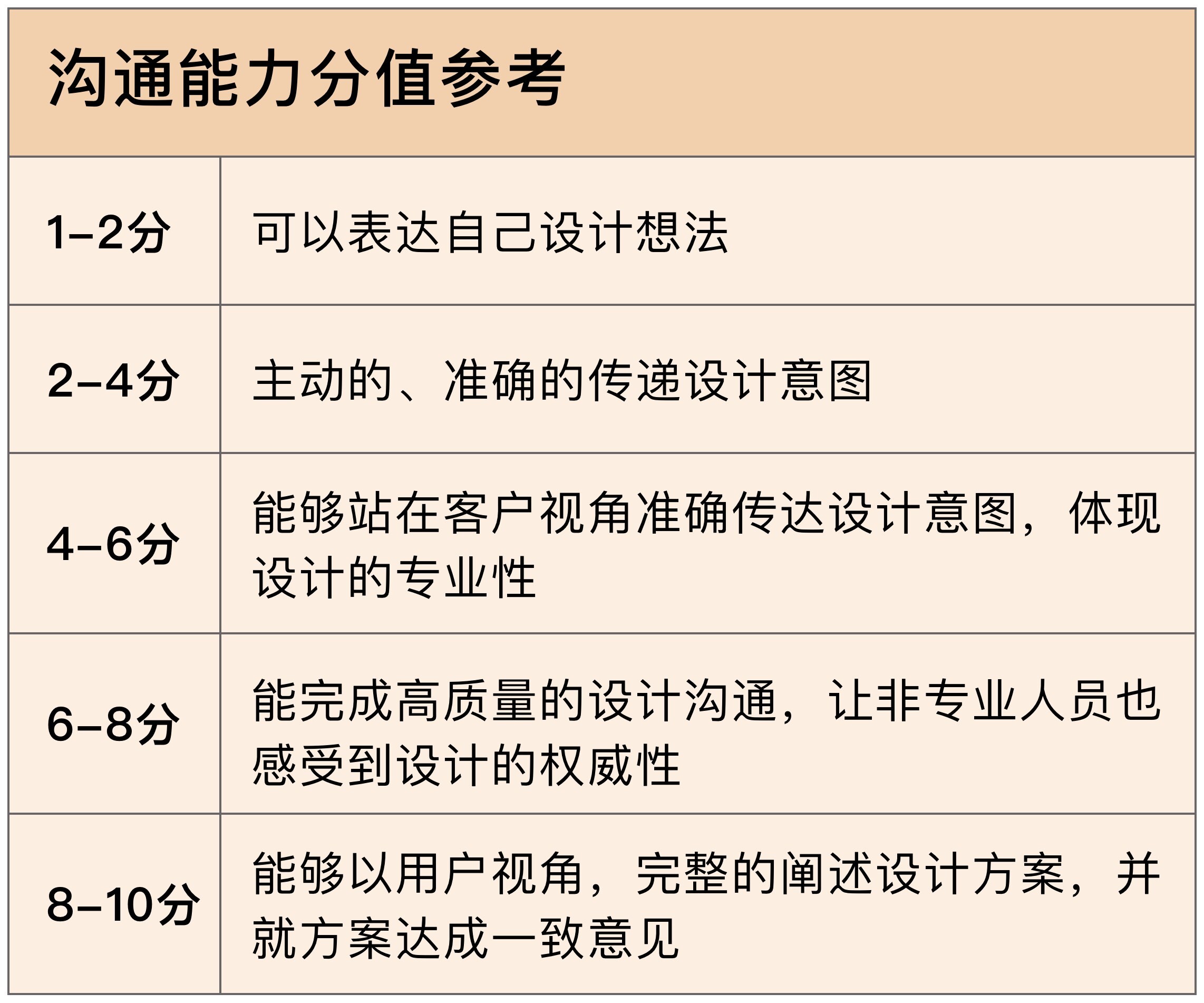 有了定义,有了分值,那我们怎么针对设计师在沟通能力方面,进行一个打分呢?