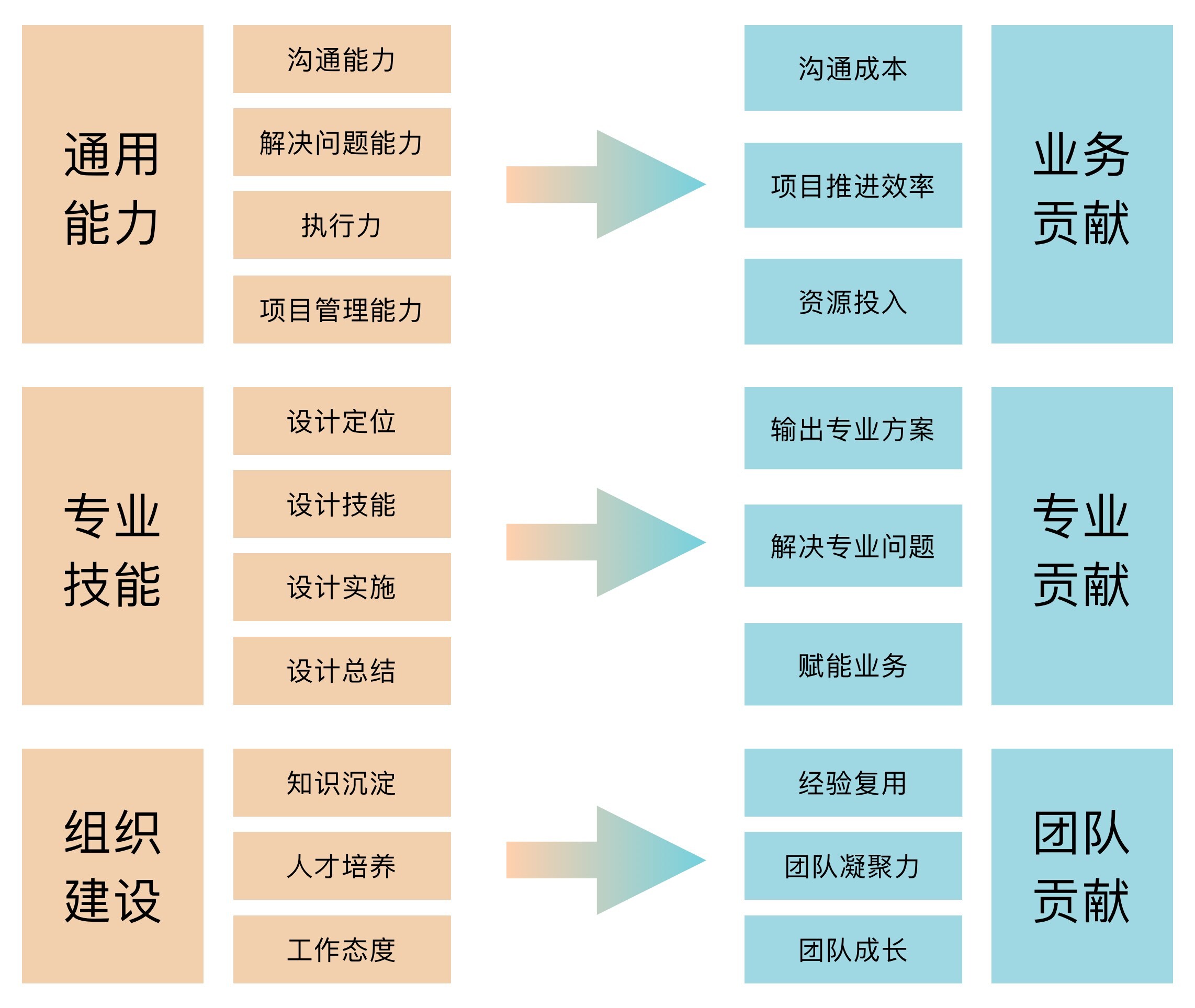 针对设计师的能力量化,我们总结了一个全面的设计师能力模型。在行业里,一般会将能力分为三类,分别是通用能力、专业技能和组织建设,每一类下面又细分更小的能力项。