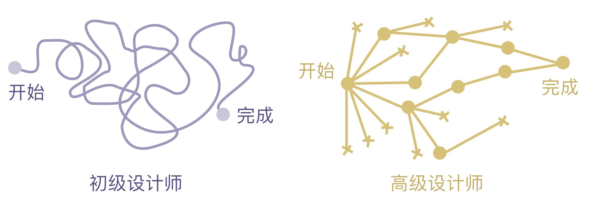 高级设计师输出的东西也会左右反复,但是是有序地在往最优目标迭代进化;初级的就比较随机,思路比较混乱。给别人的感受是不稳定,可靠性有待提升。