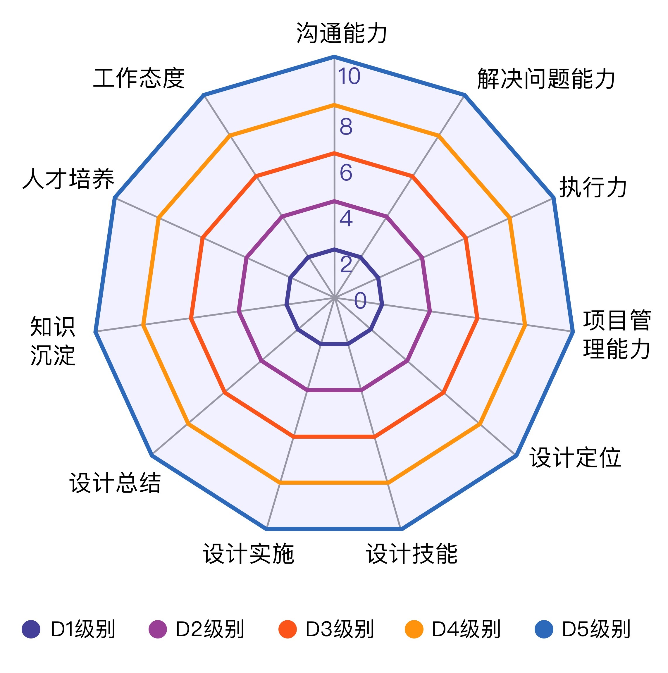 根据上面的能力细项拆解以及分值的划分,我们初步可以把设计师分为5个等级。也就是从D1到D5,我们通过一个能力雷达图就可以非常直观地看到了。