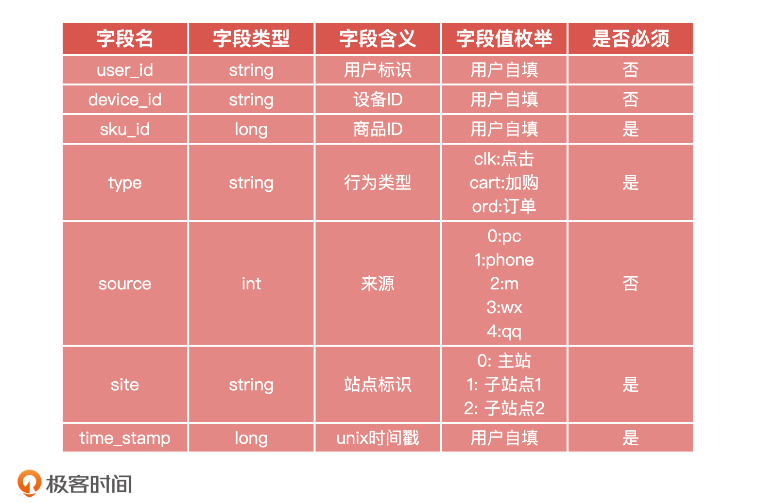 那么问题来了,我们都需要埋哪些数据,把它们埋在哪些页面呢?这需要产品经理根据自己对业务的理解,整理出一套页面埋点文档,为算法同学提供数据支持。虽然根据业务的不同,具体的埋点策略会有差别,但我还是根据经验梳理出了一些用户行为与商品信息的数据埋点字段,供你参考。