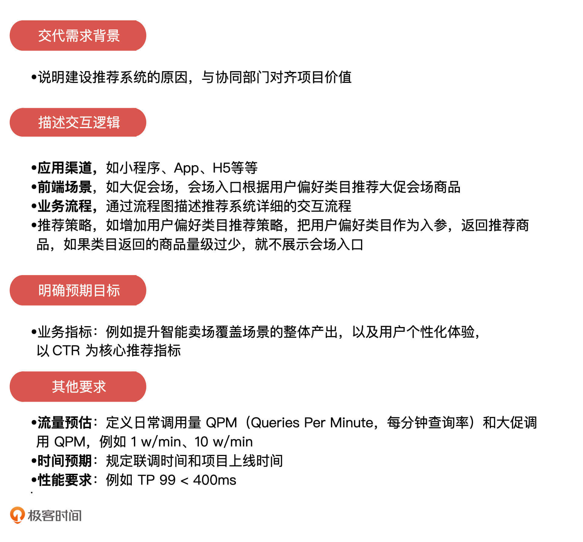 总的来说,产品经理要能够清晰地设计需求,需求定义要明确需求背景、描述交互逻辑,以及制定预期目标,那么如何做才是清晰的设计需求呢?我为你准备了一份推荐系统需求模板,你可以作为参考。