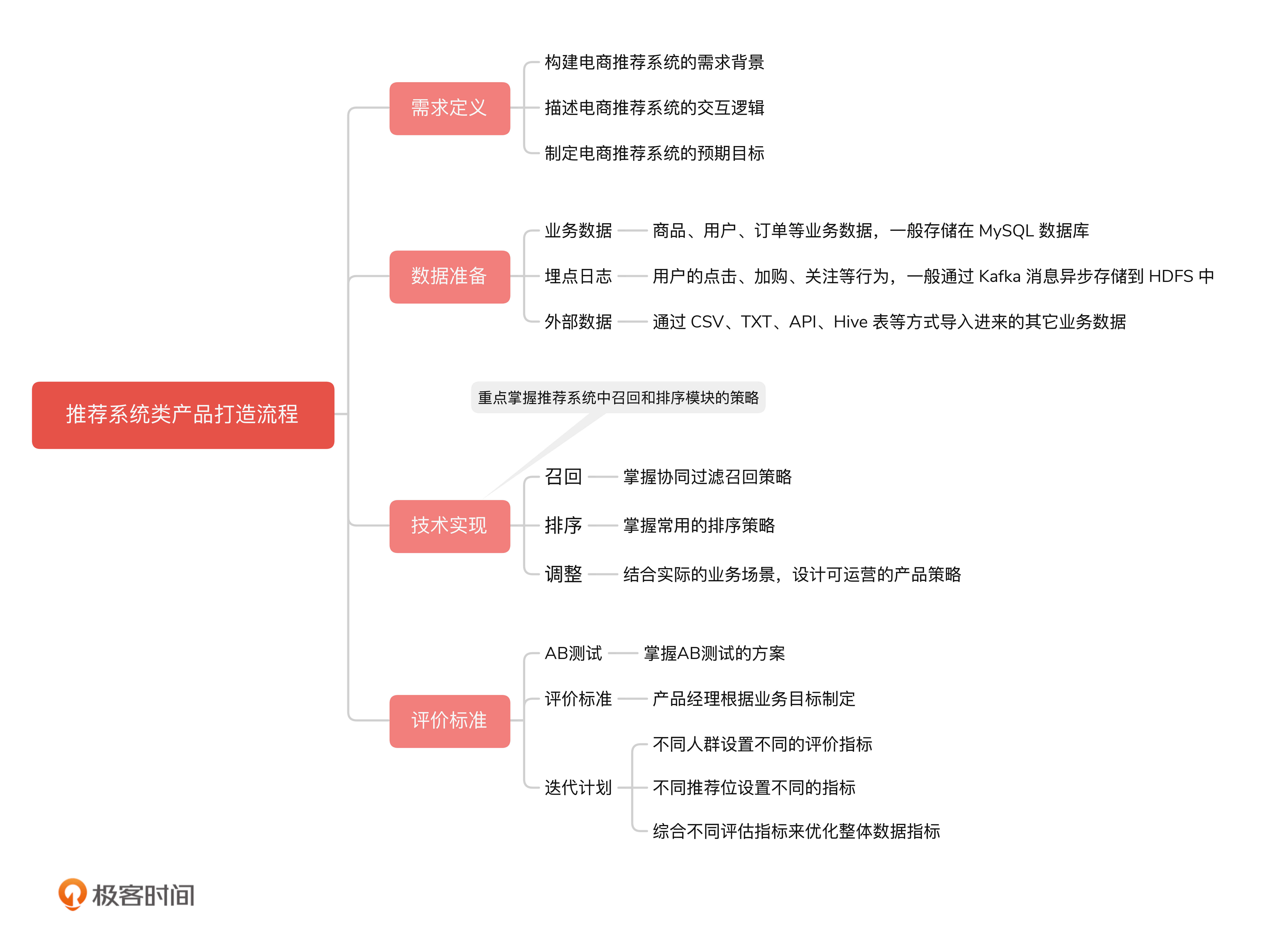 这样,整个工程上的数据流向我们就讲完了,但这只是一个最为简单的 MVP 推荐系统的构建。在实际情况下,技术同学还需要考虑很多非功能性的需求,比如系统响应时长、系统稳定性等等,但产品经理的重点还是要放在“召回”、“排序”和“调整”上面。