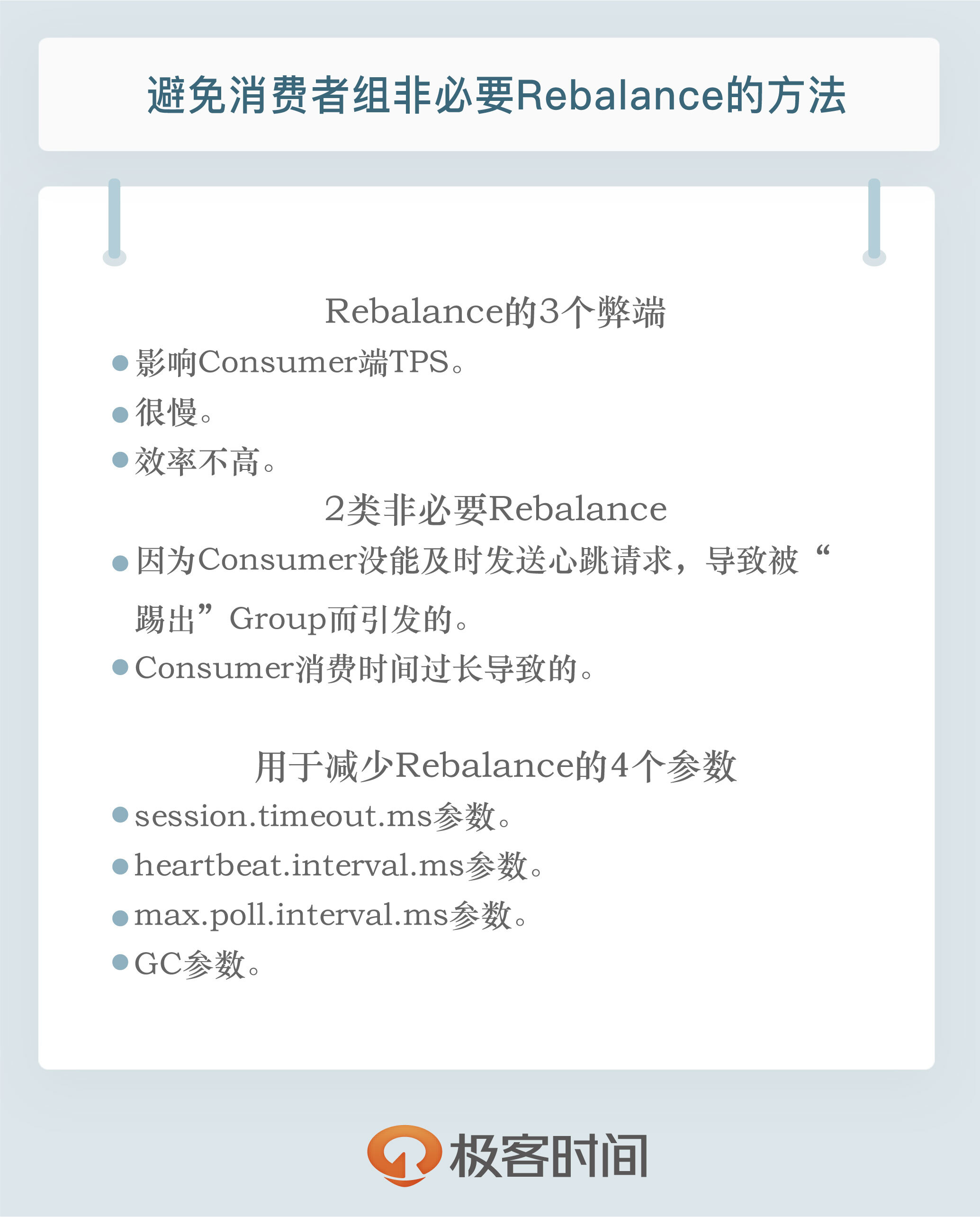 总之,你要为你的业务处理逻辑留下充足的时间。这样,Consumer就不会因为处理这些消息的时间太长而引发Rebalance了。