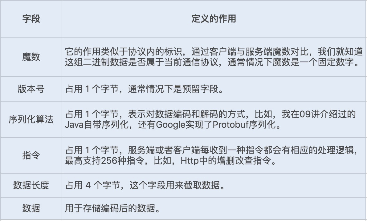 在09讲中,我们分析过序列化编码和解码的过程,对于实现一个好的网络通信协议来说,兼容优秀的序列化框架是非常重要的。如果只是单纯的数据对象传输,我们可以选择性能相对较好的Protobuf序列化,有利于提高网络通信的性能。