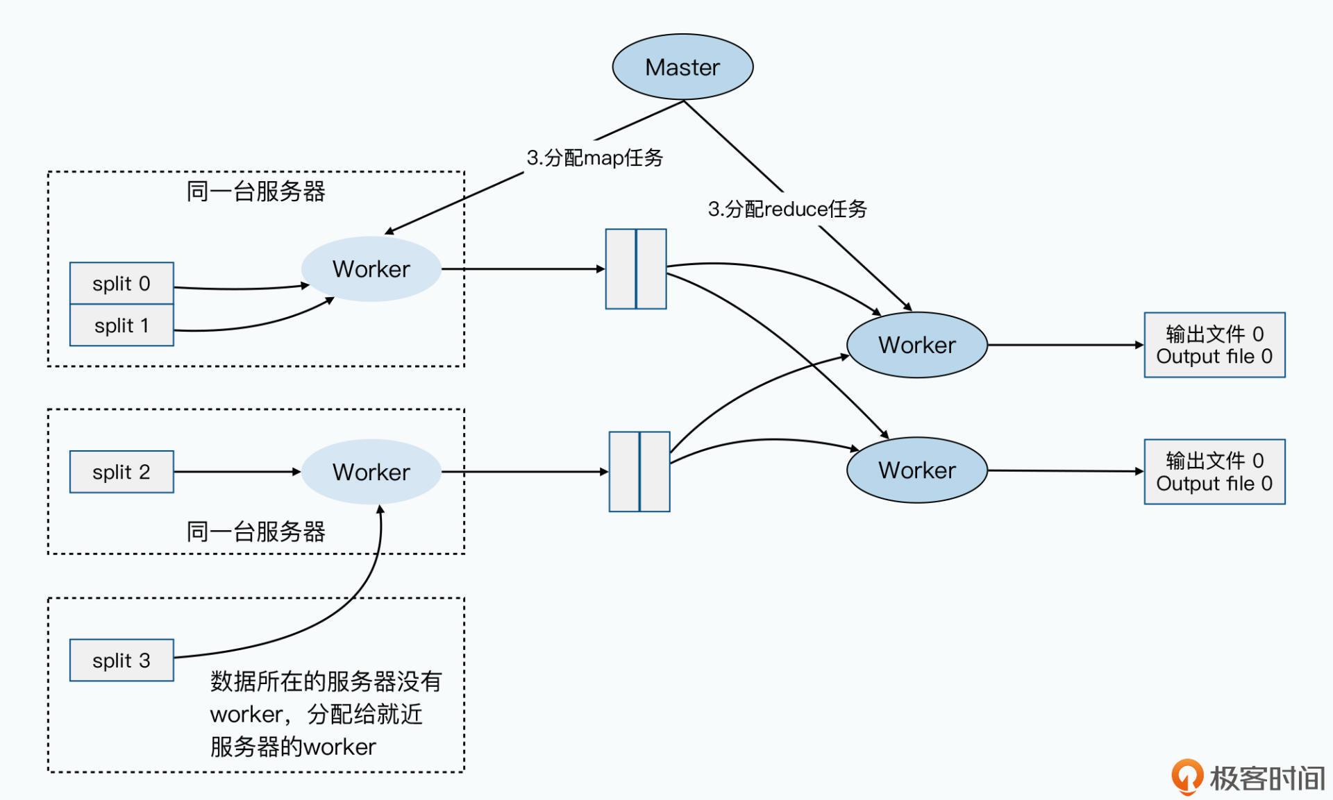 在MapReduce这个框架下,就是在分配map任务的时候,根据需要读取的数据在哪里进行分配。通过前面GFS论文的学习,我们可以知道,GFS是知道每一个Block的数据是在哪台服务器上的。而MapReduce,会找到同样服务器上的worker,来分配对应的map任务。如果那台服务器上没有,那么它就会找离这台服务器最近的、有worker的服务器,来分配对应的任务。你可以参考下面给出的示意图: