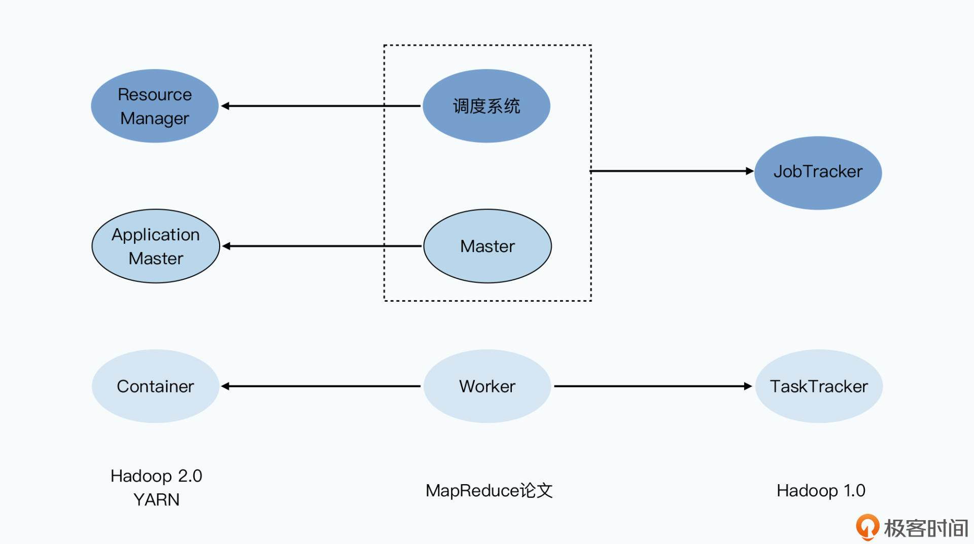 所以之后在Hadoop 2.0,Hadoop社区把JobTracker的角色,拆分成了进行任务调度的Resource Mananger,以及监控单个MapReduce任务执行的Application Master,回到了和MapReduce论文相同的架构。