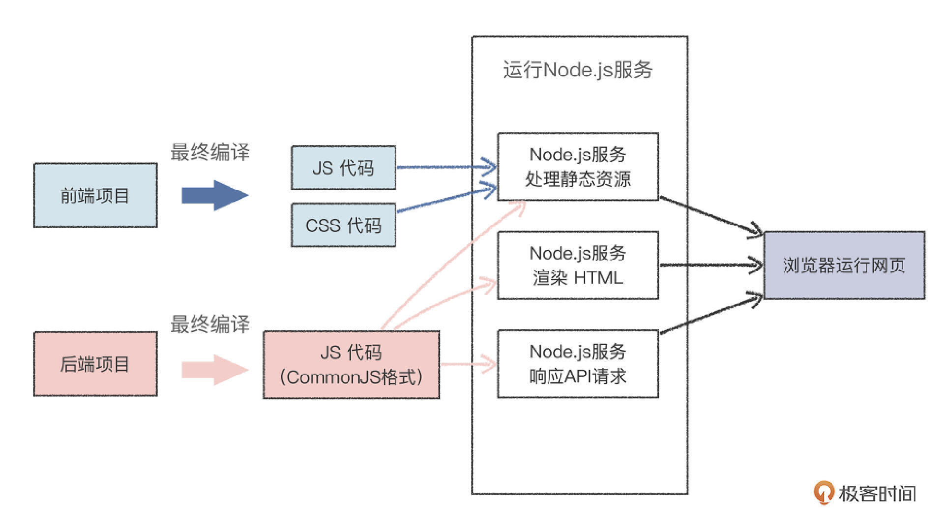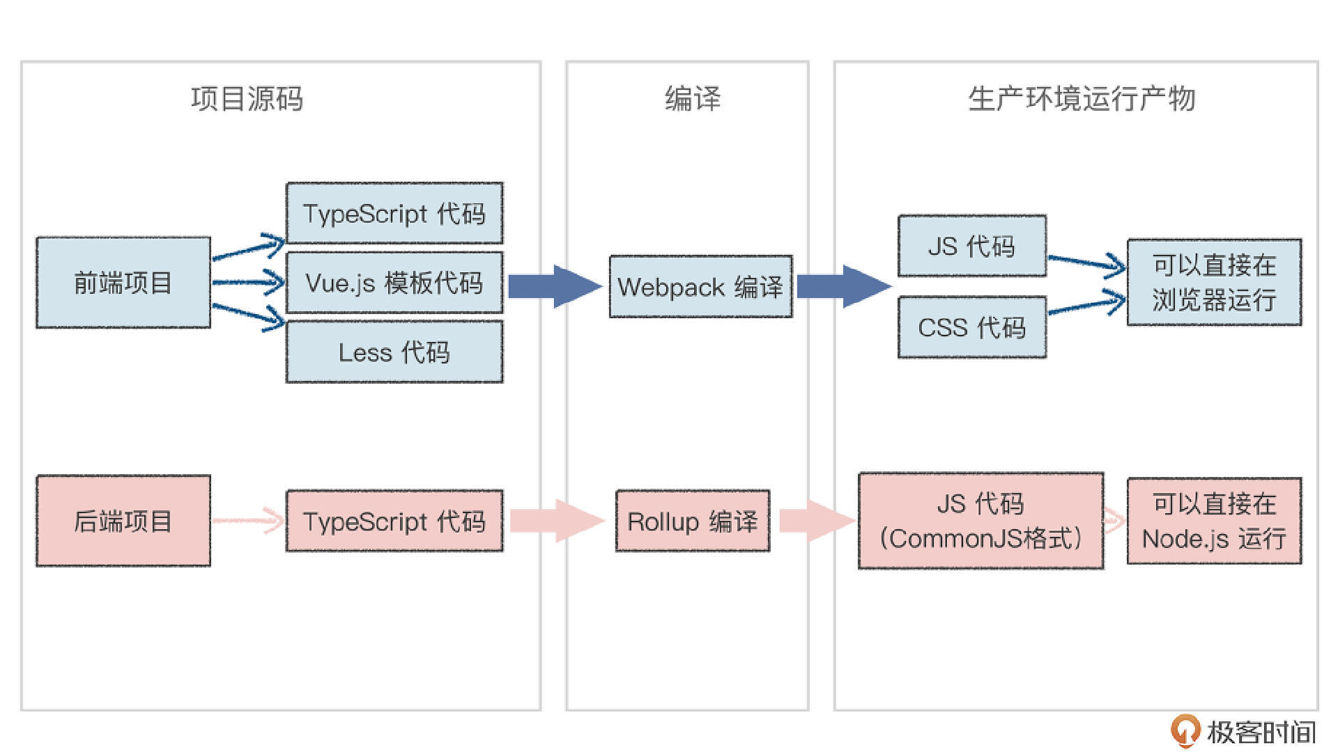 这个“变化的过程”就是将前端TypeScript和Less代码编译成JavaScript和CSS代码,能在浏览器里直接运行;将后端TypeScript代码编译成CommonJS格式JavaScript代码,能在Node.js环境里直接运行。