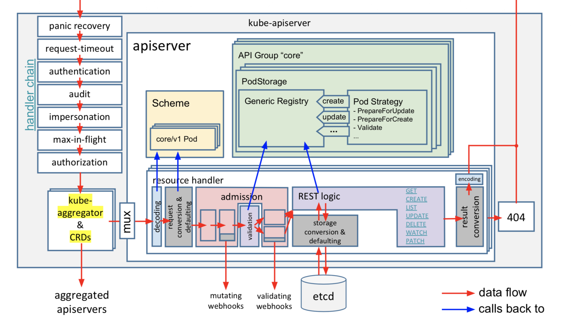 kube-apiserver启动的时候,会将每个资源的APIGroup、Version、Resource Handler注册到路由上。当请求经过认证、限速、授权、准入控制模块检查后,请求就会被转发到对应的资源逻辑进行处理。