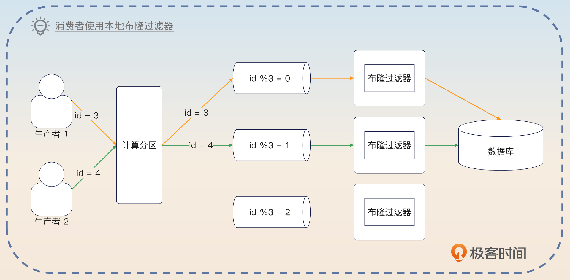 当然,在消息队列的场景下,这个问题就变成了在发消息的时候要把同一个业务的消息发到同一个分区。这样就可以在消费者身上使用基于本地内存的布隆过滤器了。