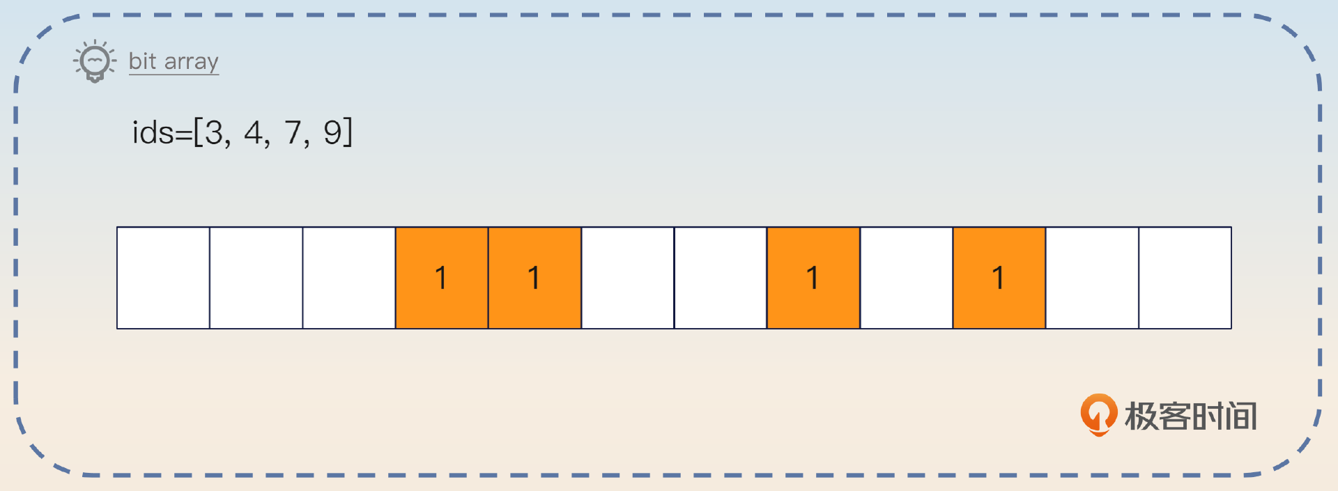 和布隆过滤器类似的还有 bit array,也叫做 bit map。它也是用一个比特位来代表元素是否存在,1 代表存在,0 代表不存在。它和布隆过滤器的核心区别是它不需要哈希函数,因为它的值本身就是一个数字。比如说,你的用户 ID 是数字,那么你就可以把 ID 当成 bit array 的下标,对应位置的比特位是 1。
