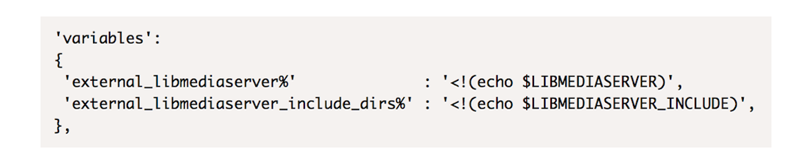 代码中的 variables 用于在GYP规则文件中定义全局变量,这些全局变量被定义好后,就可以在规则文件中的任何地方被引用了。