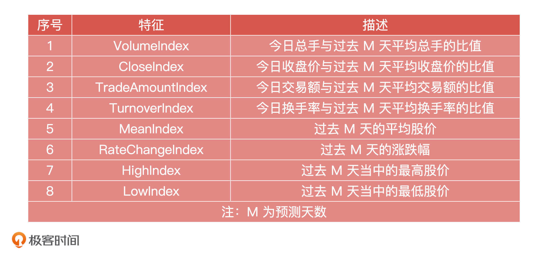 在模型设计完成之后,我们就要建立特征工程了。模型里所用到的输入特征数据是由股票基础指标计算得出,这些指标分别是前收盘价、开盘价、最高价、最低价、均价、成交量、成交额、涨跌、涨跌幅、换手率、收盘价。我们会根据这些指标构造出 8 个特征向量,这些指标一般和股价具有较强的相关性,特征向量如下: