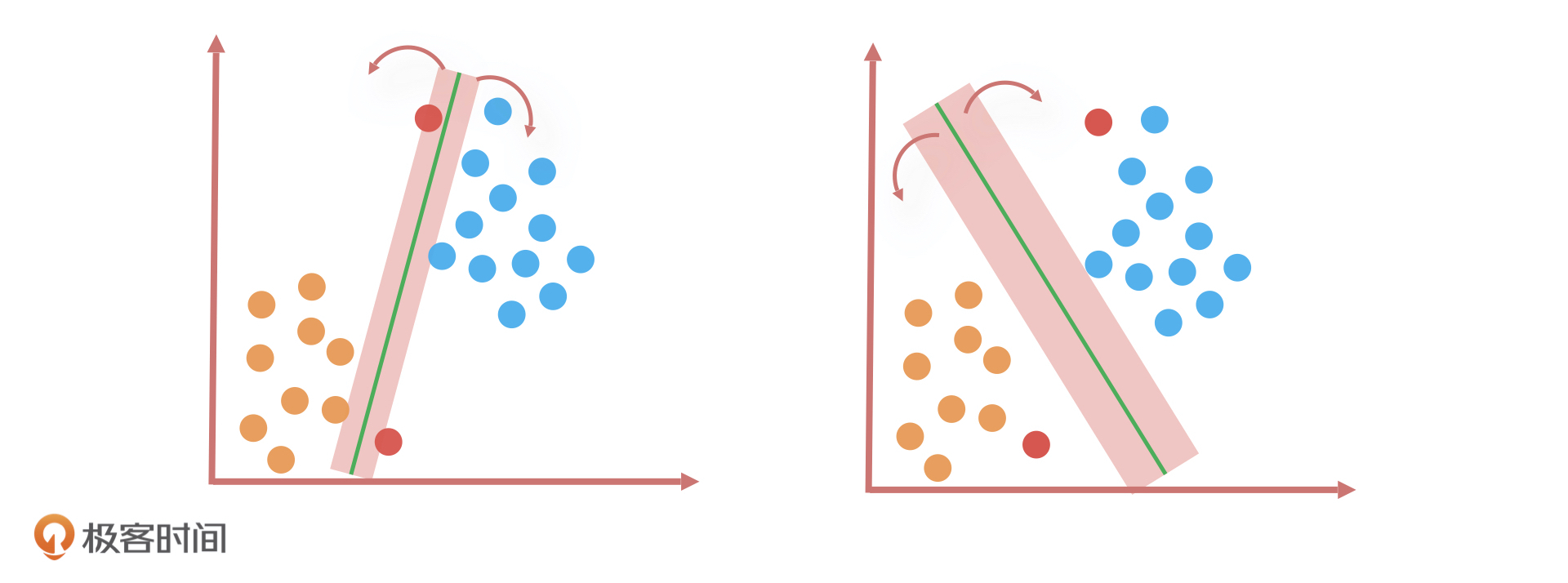 那为什么一定要找到间隔最大的这条直线呢?它除了能让分类样本的区分度最高,还有一个好处,就是当新数据发生波动的时候,就算超过了原有数据样本点的最近边界,分类结果仍然不会受到影响。因此,寻找最大间隔的过程也是 SVM 算法最优化参数的过程。