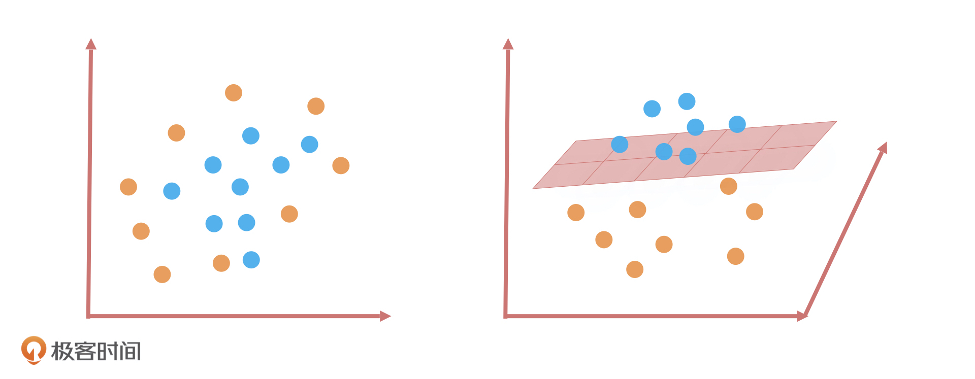 - 当小球数据是线性不可分的时候,SVM 的做法就是通过核函数把小球映射到高维空间中,构造出一个超平面,让小球样本在高维空间中线性可分。
