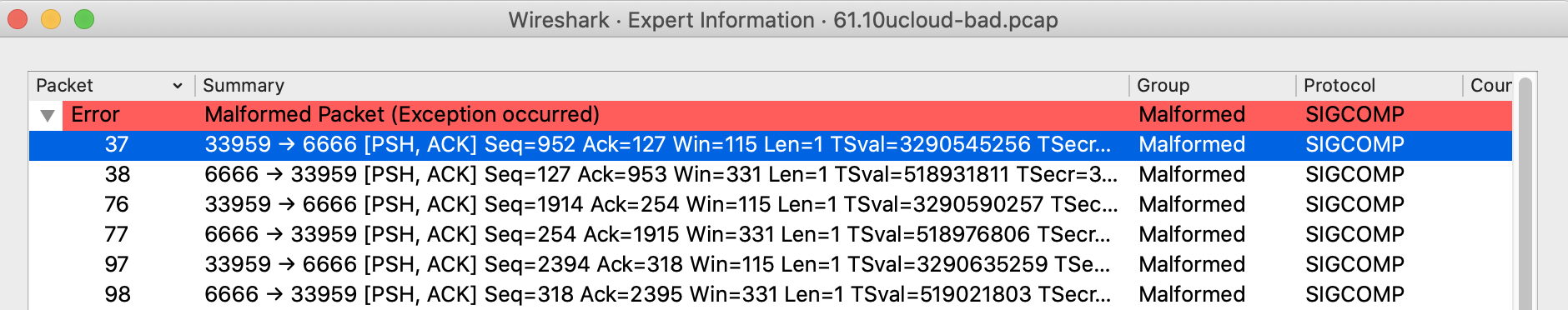 然后选了另外几个Malformed Packet,发现它们都是成对出现的。它们还有一个特征是: