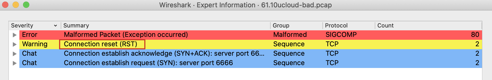 可见,有80个Error级别的Malformed Packet(格式错误)报文和2个RST报文,都很可疑。
