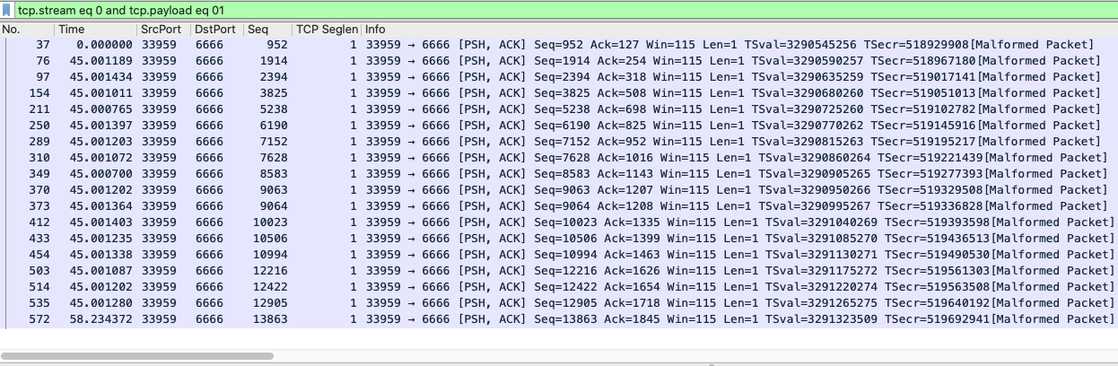 我们通过前面的分析发现,心跳探测包的报文数据是01,心跳回复包的报文数据是41。所以,让我们再次借助强大的过滤器。在 tcp.stream eq 0 后面添加 and tcp.payload eq 01,即整体过滤器变为: