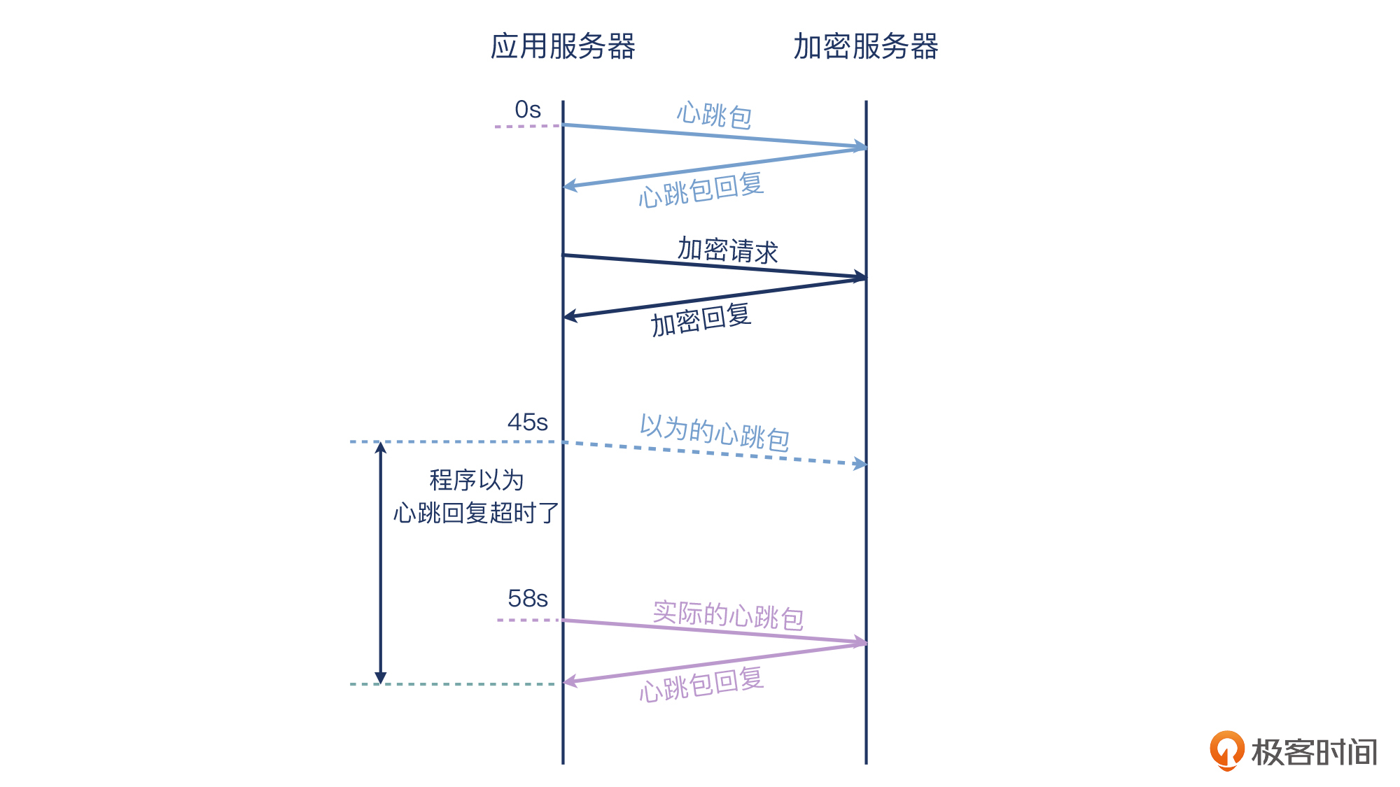 现在,我们已经清楚了这个报错的原因:客户端程序出了一个Bug,某一次心跳探测包发出的时候是在上一次心跳的58秒以后(也就是相对正常情况,迟了13秒)。那么,服务端虽然立即发送了心跳回复包,但也一样是在58秒以后了。程序的逻辑非常简单粗暴:一旦心跳回复包的到达时间超过了第46秒(也就是45秒+1秒超时),就认为是心跳探测失败。