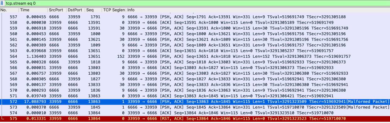我们选中575号报文,然后Follow -> TCP Stream,得到了这个RST所在的TCP流的全部报文: