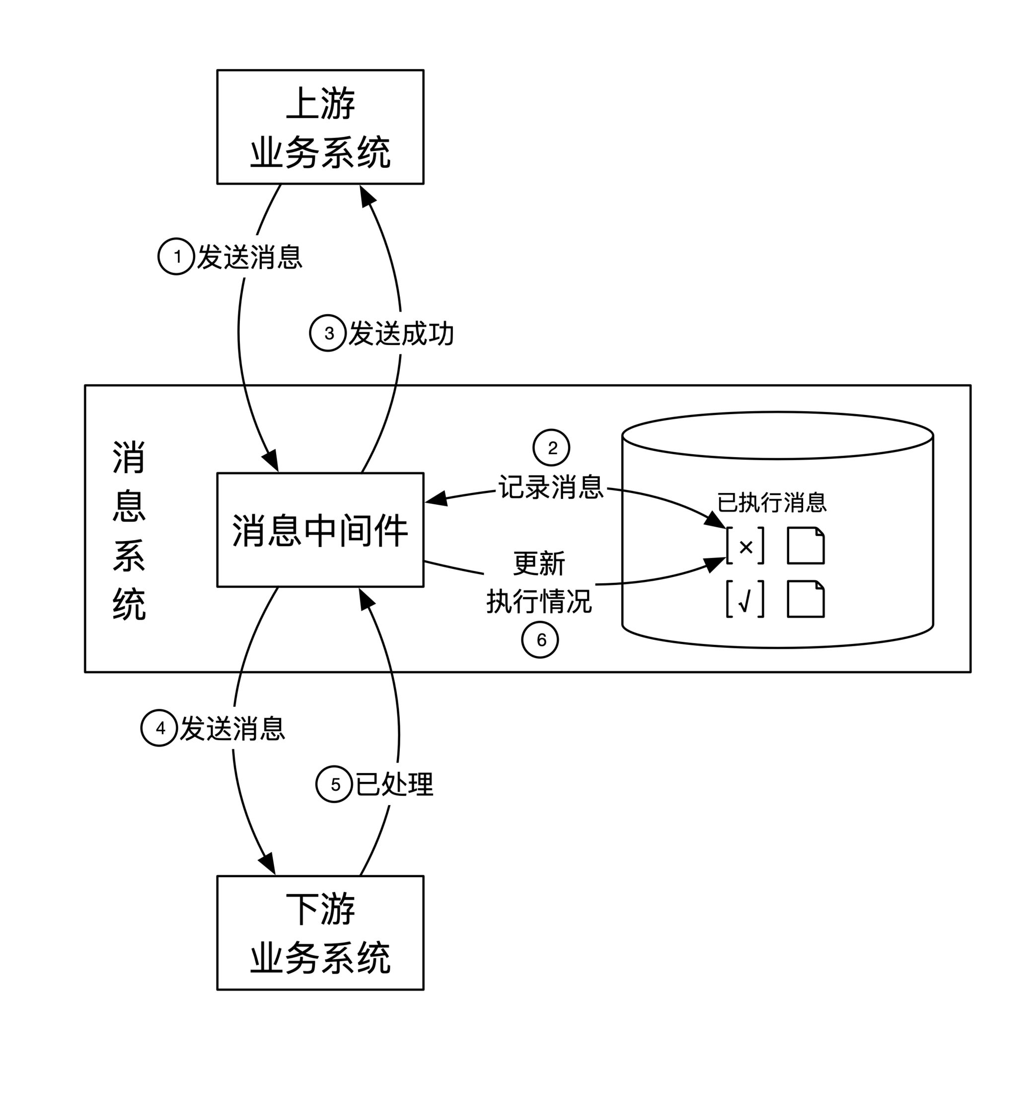解决方法和上游系统类似,下游系统也会通过独立的消息中间件,实现和上游系统的正确交互。消息中间件在收到上游发过来的消息后先记录到数据库,然后再通知下游的业务系统处理。整个过程也同样分为6步: