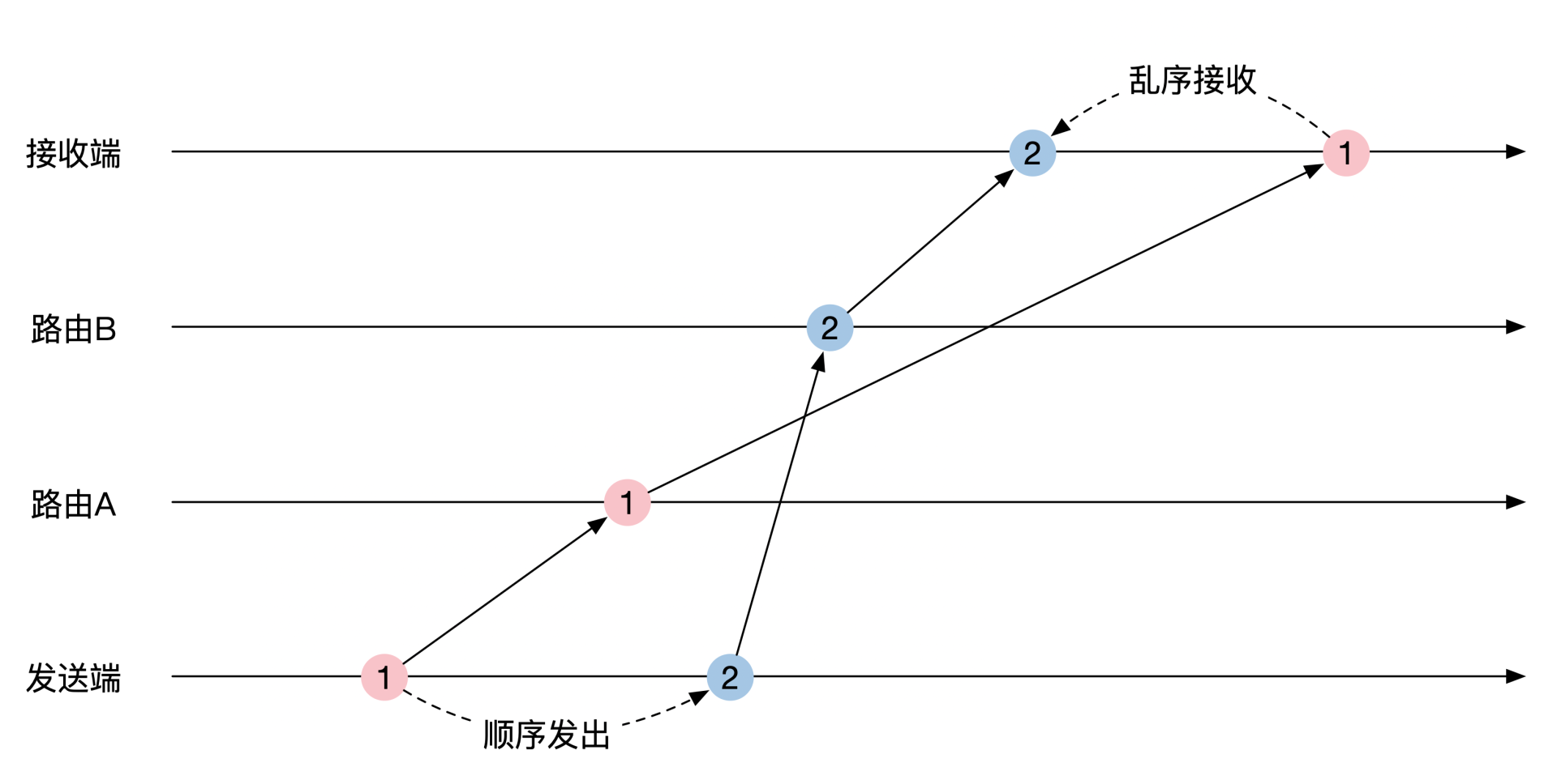 举个例子。发送端和接收端中间有两个路由,分别是路由A和路由B。发送端一前一后分别给这两个路由发了一个消息。这两个路由将消息传递给接收端的速度不一样,最终导致消息的接收顺序错位。示意图如下: