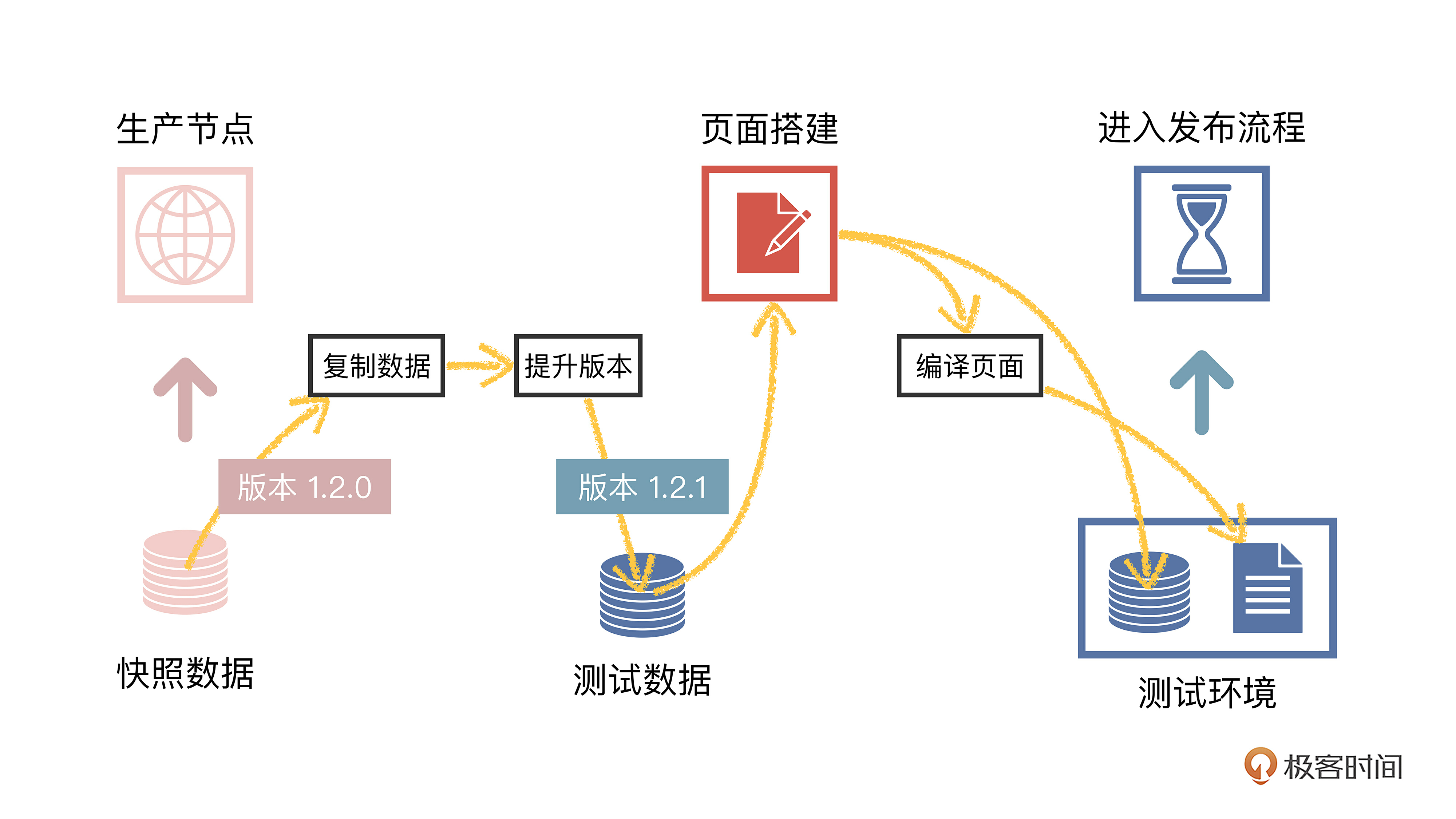 我画了一张具体的流程图,“数据”和“文件”重新投入到发布流程中,再次经过测试、预发和生产三个流程节点,把页面内容恢复到生产环境里。可以分成两步。