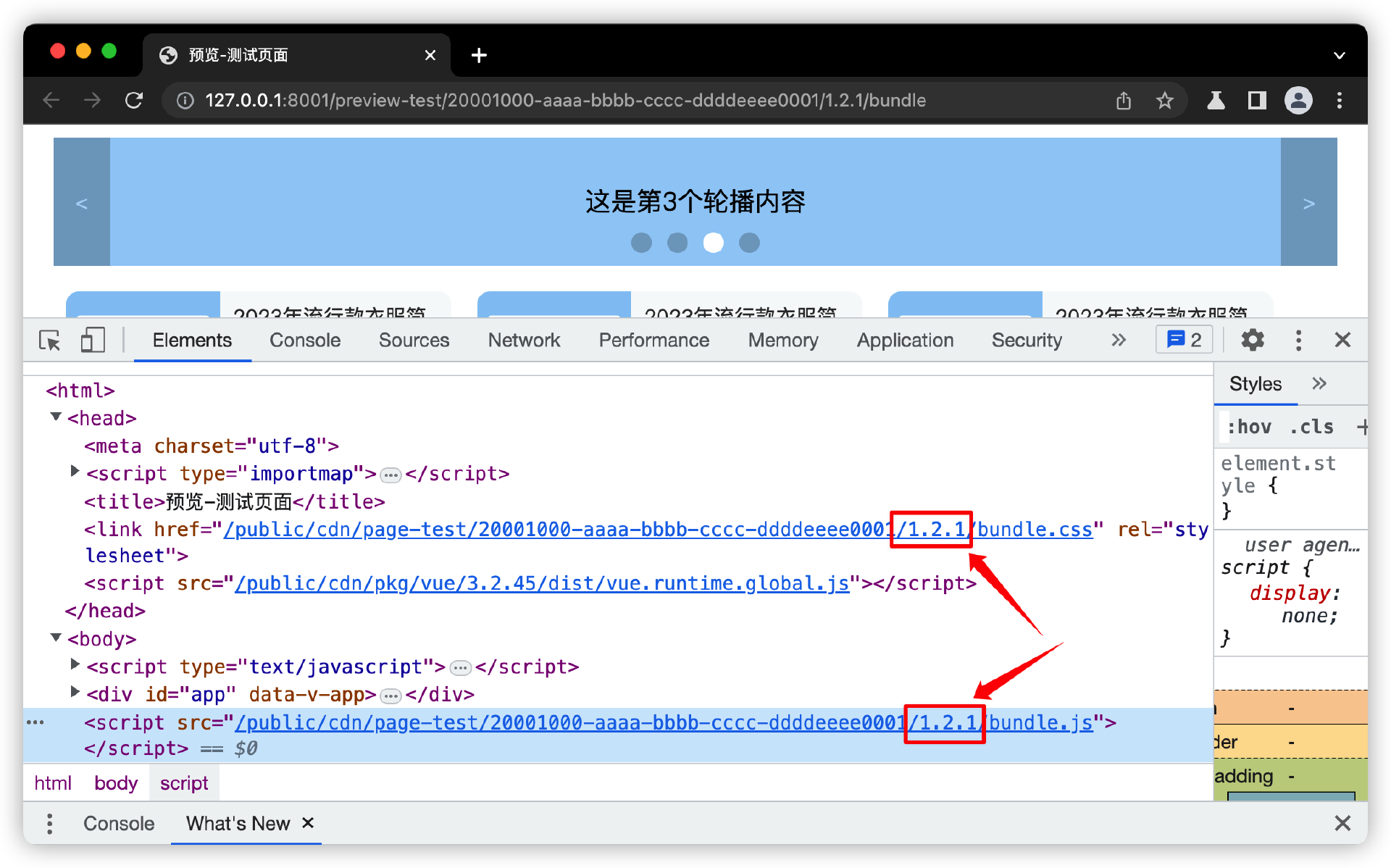 其实,我们之前在“[页面编译]”和“[后台发布流程]”两节课中,已经把页面按版本增量编译了。你可以启动执行上节课“页面发布流程”的源码案例,在发布流程中,能发现每次版本迭代发布后,生成的预览页面都带有版本号,同时,Bundle文件路径也带有版本号,而且生产环境的预览页面的JavaScript和CSS的Bundle都带有版本号。