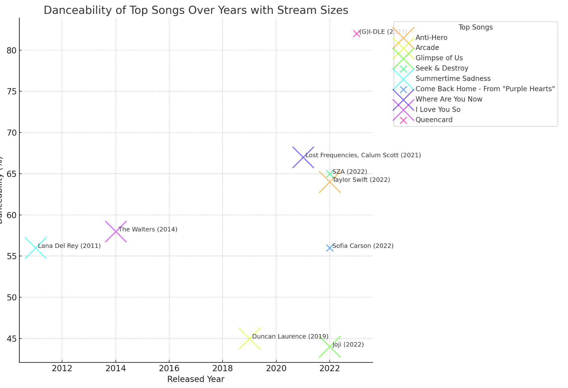 这张图展示了不同年份的热门歌曲的可跳舞性与流媒体播放量的关系。