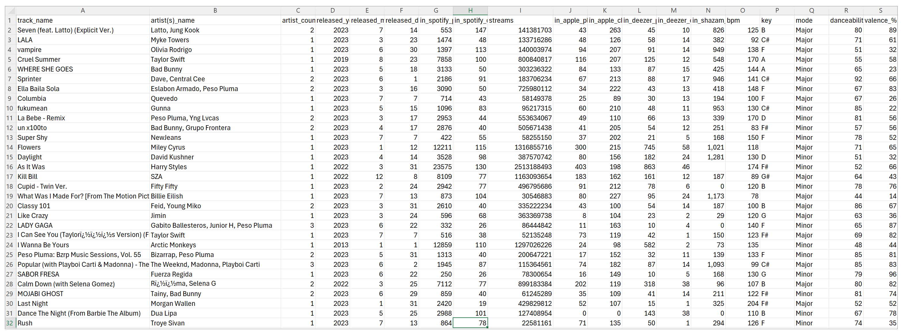 项目目标:流行音乐趋势分析 先来看看这份从Spotify App中搜集来的,播放量最多的流行音乐数据表。