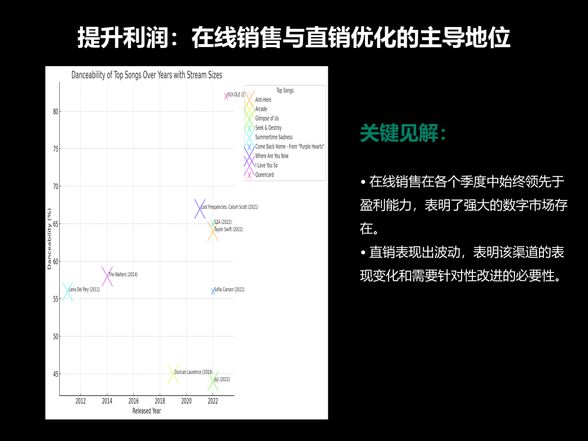 1 2 1. "2019至2023年间,畅销歌曲的跳舞性明显上升,展现了流行音乐向更加活跃风格的转变。" 2. "Taylor Swift和Duncan Laurence的歌曲以超高流量领跑,彰显了其在全球音乐市场的巨大影响力。"